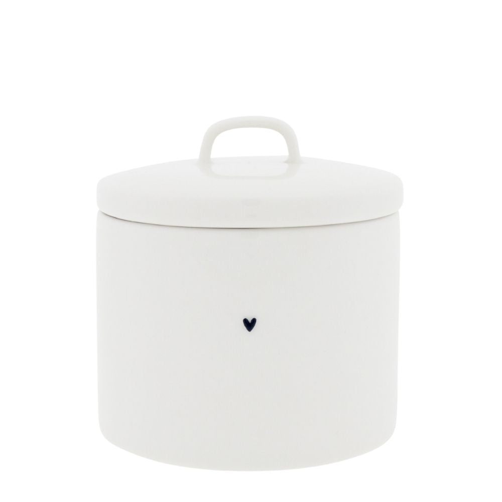 Das schlichte Design in reinem Weiß wird durch ein kleines schwarzes Herz auf der Vorderseite liebevoll ergänzt. Dieses Herz verleiht der Dose eine persönliche Note und macht sie zu einem hübschen Hingucker, der sich wunderbar in jedes Zuhause einfügt. Egal ob in der Küche, im Bad oder im Büro – die Dose bringt Ordnung mit Stil.