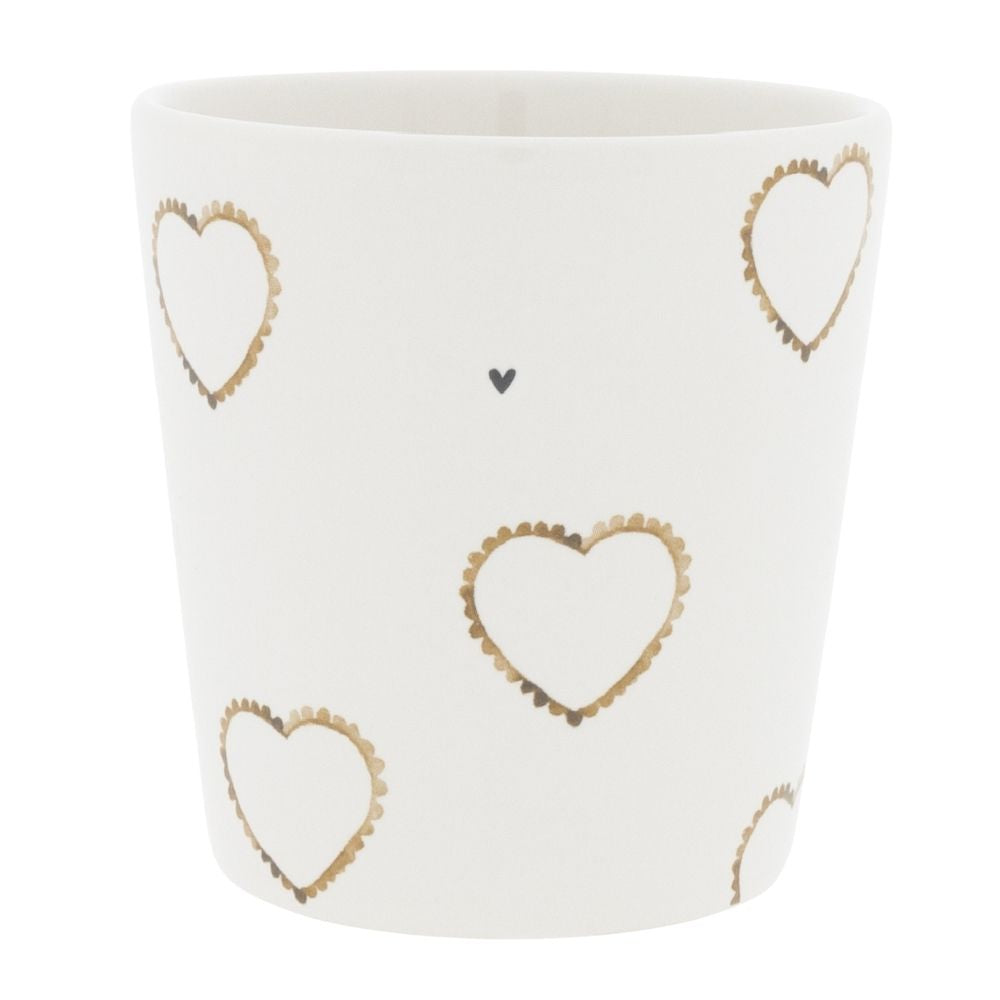 Dieser bezaubernde Becher von Bastion Collections besticht durch seine schlichte Eleganz und liebevollen Details. Die weiße Keramik wird von großen, braunen Herzen geschmückt, die einen zarten, filigranen Rand haben. In der Mitte des Bechers befindet sich ein kleines schwarzes Herz, das dem Design eine subtile und persönliche Note verleiht. Die braunen Herzen wirken fast wie kleine Kunstwerke und machen den Becher zu einem echten Hingucker.