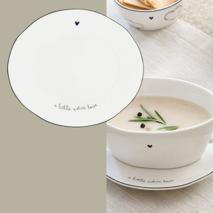 Ganz oben auf dem Teller findest du ein kleines schwarzes Herz, das sofort ins Auge fällt und dem Teller eine persönliche, warme Note verleiht. Ganz unten ziert den Teller der liebevolle Spruch A little extra love, in geschwungener Schrift geschrieben. Dieser kleine Satz erinnert dich jedes Mal daran, wie wichtig es ist, auch in den kleinen Momenten Liebe und Aufmerksamkeit zu schenken.