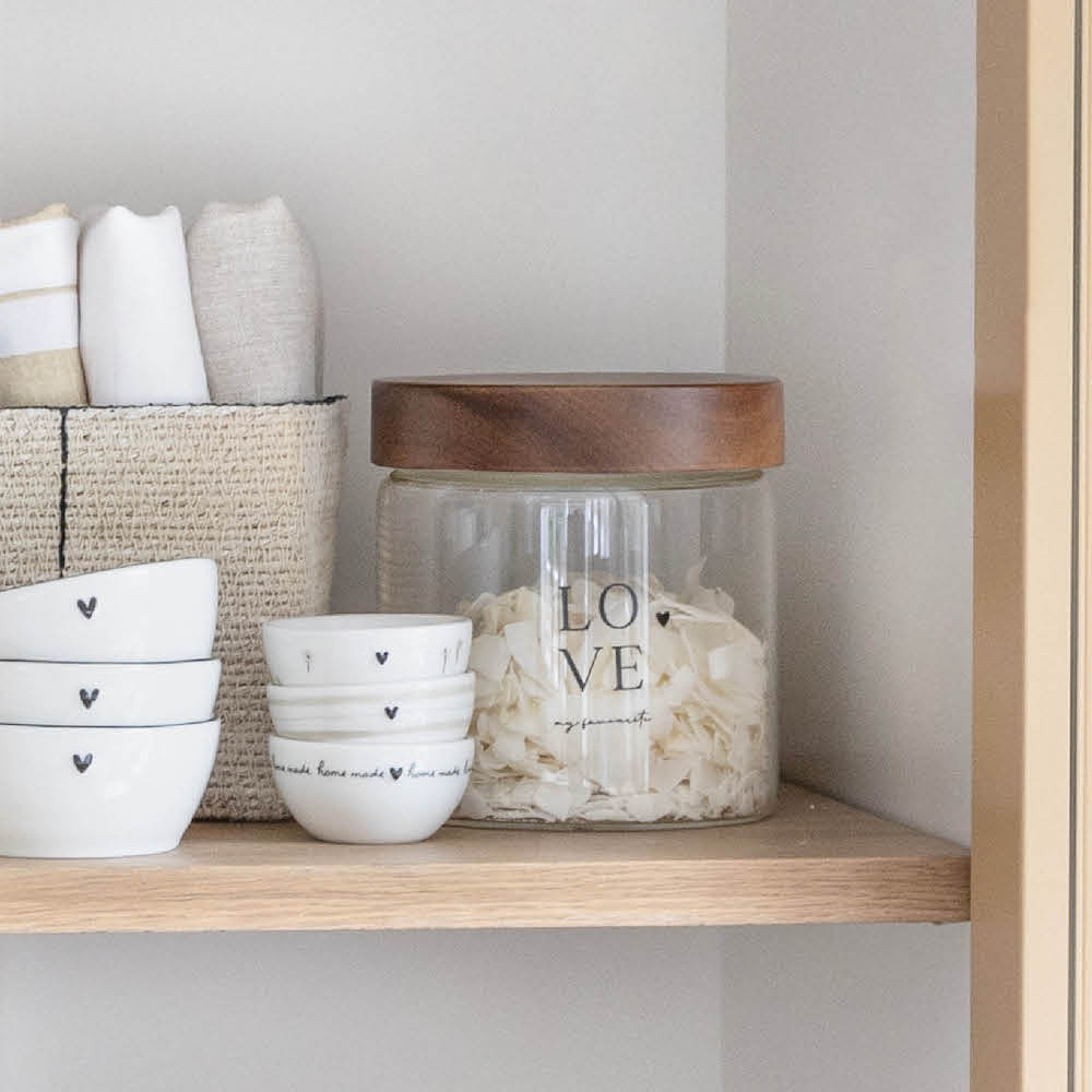 Nicht nur in der Küche macht die kleine Vorratsdose LOVE My Favorite eine gute Figur. Auch im Badezimmer ist sie nützlich für Haargummis und Spangen. Mit einer Höhe von 13 cm und einem Durchmesser von 12 cm ist die Vorratsdose eine tolle Aufbewahrungsmöglichkeit und lässt sich sehr gut mit anderen Produkten von Bastion Collections kombinieren.
