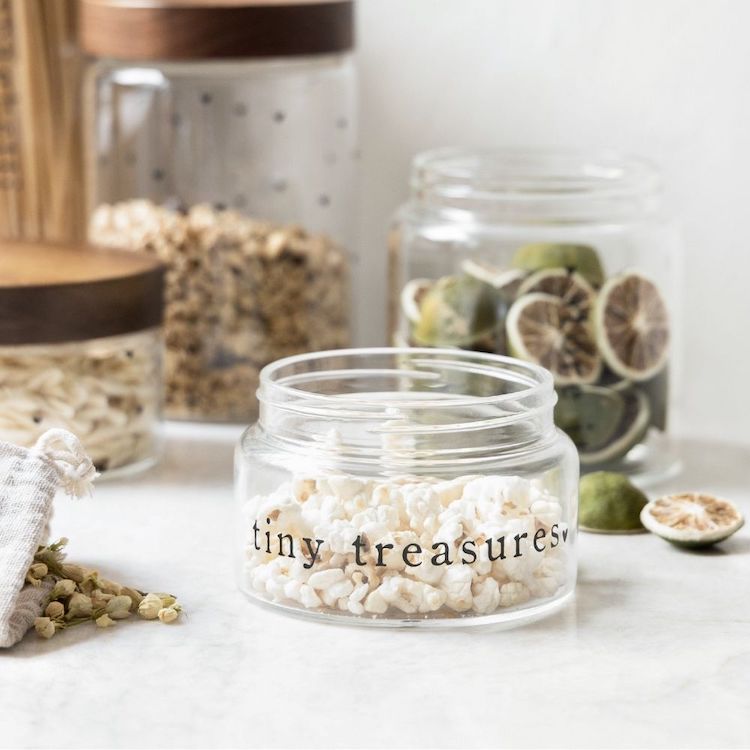 Die liebevoll gestaltete Glasdose von Bastion Collections mit dem trendigen Schriftzug Tiny Treasures ist ein dekorativer Hingucker mit Charme. Ob auf dem Schreibtisch, im Nähkörbchen oder im Regal – sie bringt nicht nur Ordnung, sondern auch eine Extraportion Herzlichkeit in deinen Alltag.