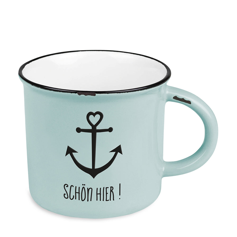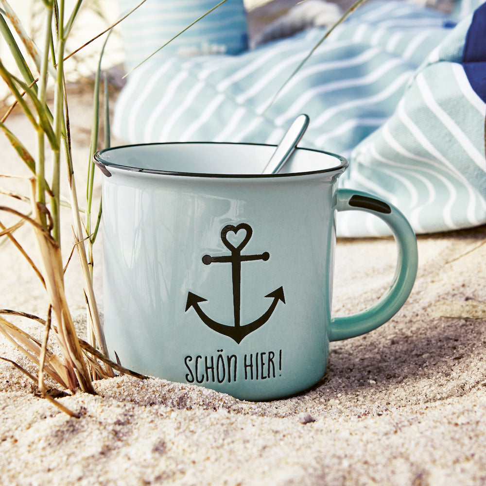 Bist Du gerade vielleicht mit einer Tasse voll mit Kaffee an Deinem Lieblingsort? Dann heißt es: Schön hier! Hier hast Du symbolisch Deinen Anker gesetzt, der auf der Vorderseite des Bechers Vintage abgebildet ist. Das schöne Graugrün des Bechers im Shabby-Stil erinnert an die raue Art des Meeres und Deine Liebe zum Meer, zum Maritimen, ist es was Dich zu diesem tollen Becher geführt hat! Haben wir Dir eigentlich schon verraten, dass der 9,5 x 13,5 cm Keramik Becher ein Fassungsvermögen von 400 ml hat und sowohl für die Mikrowelle, als auch die Spülmaschine geeignet ist?