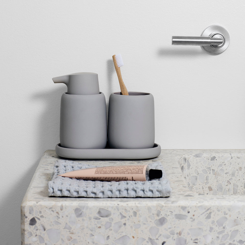 Der Seifenspender Sono Micro Chip von Blomus ist in einem modernen Design gehalten und passt dank seines dezenten Grautons zu jedem Einrichtungsstil. Der Keramik-Seifenspender von Blomus hat ein Fassungsvermögen von 250 ml, was sich aus seiner Größe von 14,5 x 9,5 cm zusammensetzt.