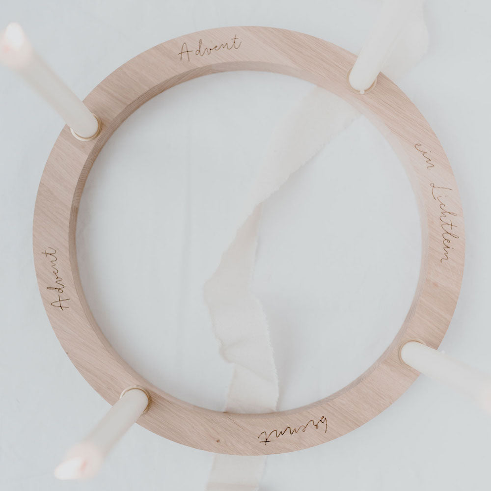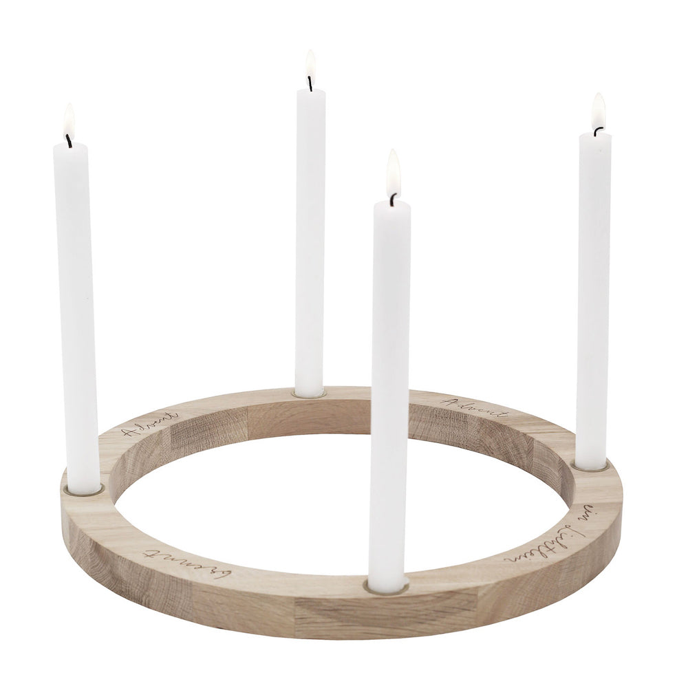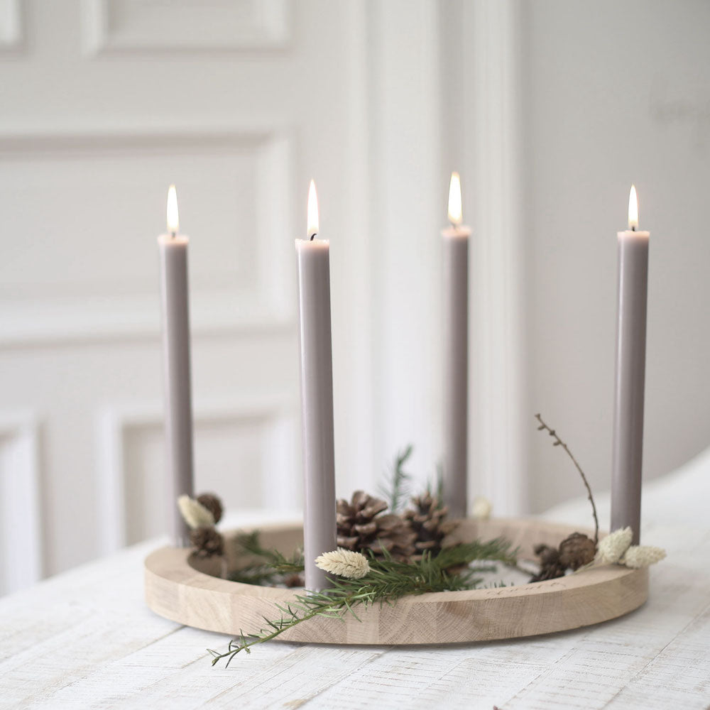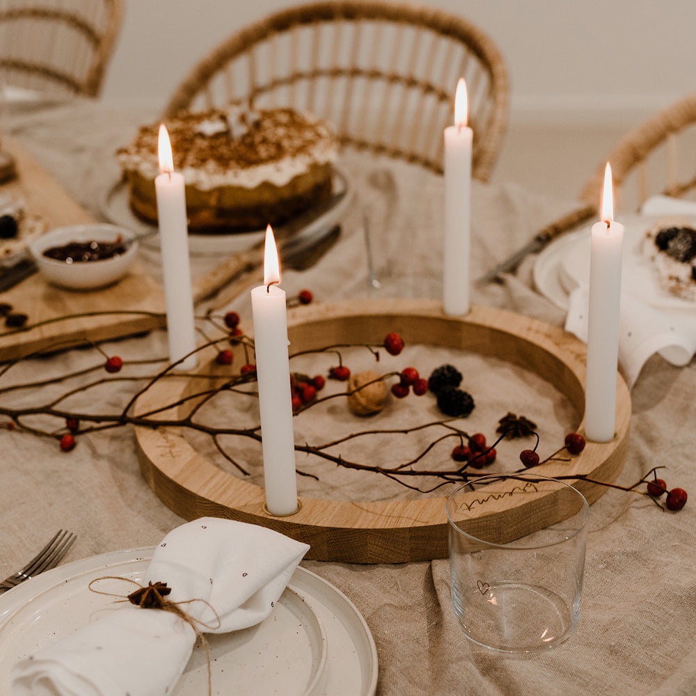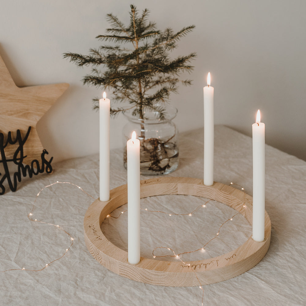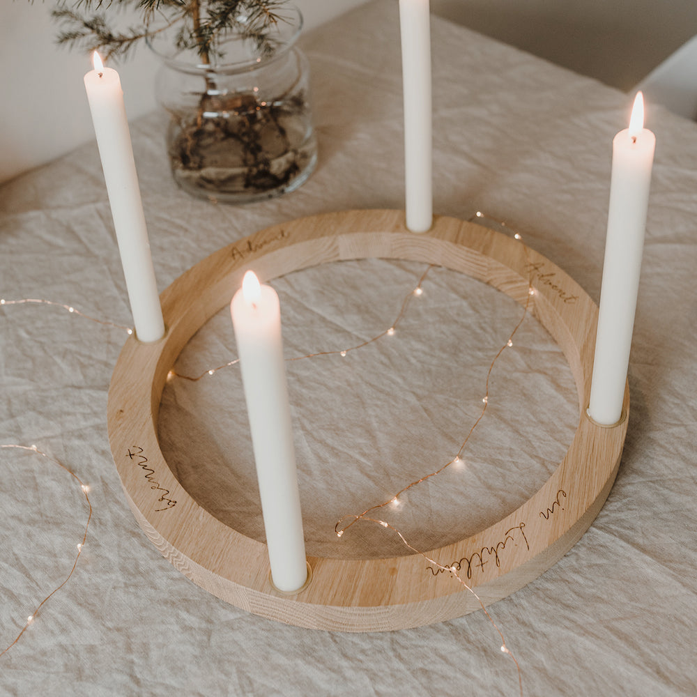 Der Eulenschnitt Adventskranz Eiche ist in der ganzen Adventszeit für Dich da und möchte Dir die dunklen Stunden erhellen. In den goldfarbenen Tüllen ist traditionell Platz für vier Kerzen, die einen Durchmesser von 2,2 cm haben sollten. Der Eulenschnitt Adventskranz misst in der Höhe 4 cm und im Durchmesser 36 cm, das macht ihn sehr stabil, aber Kerzen solltest Du dennoch niemals unbeaufsichtigt lassen.