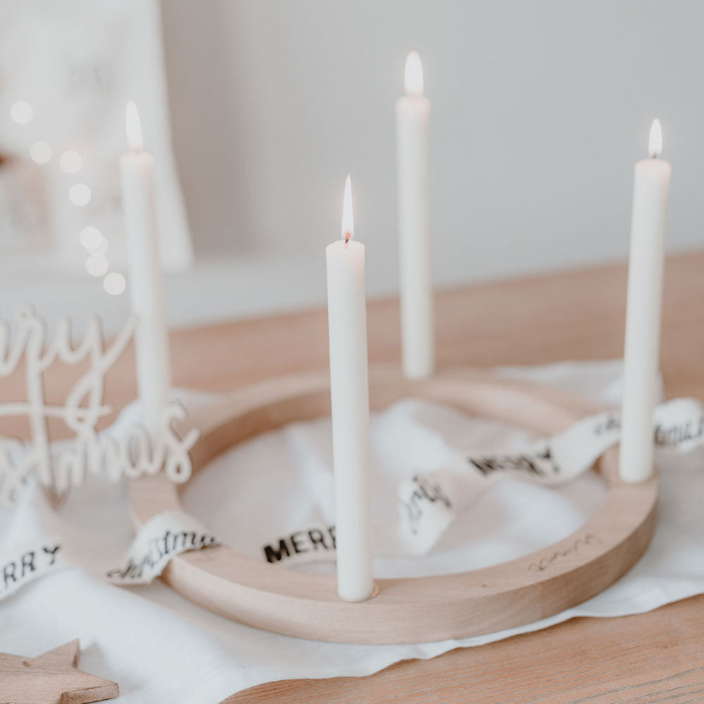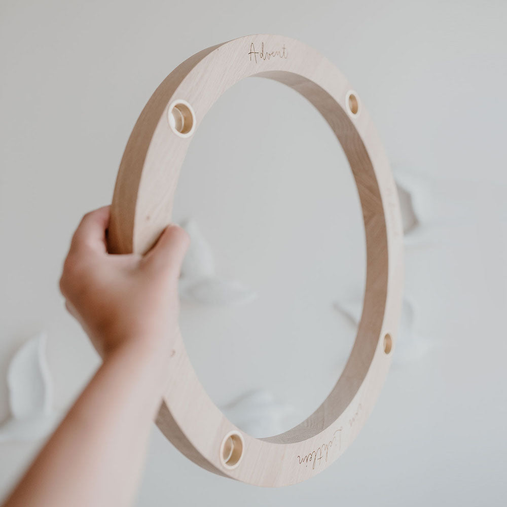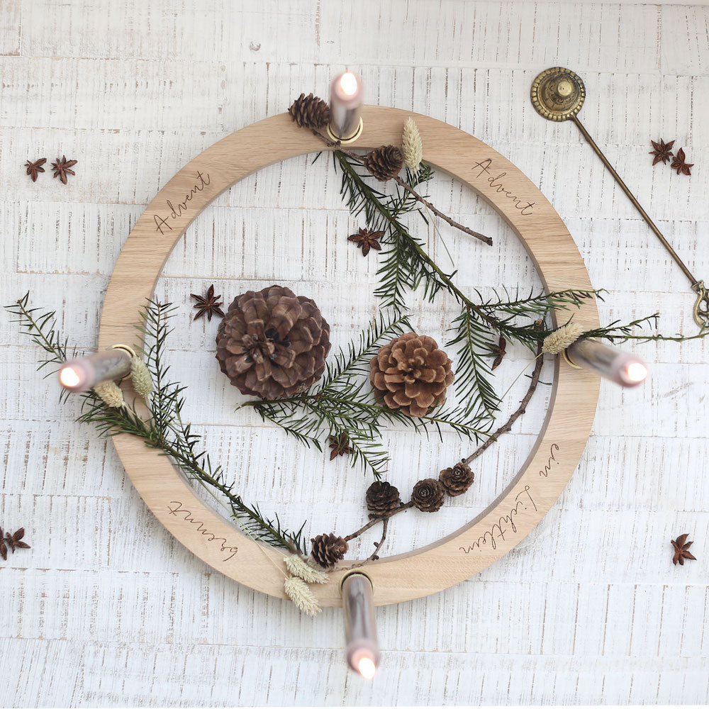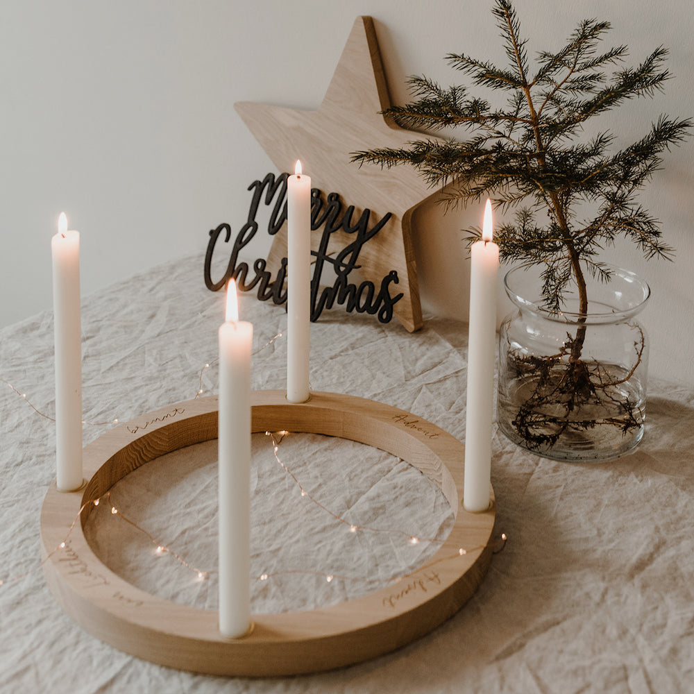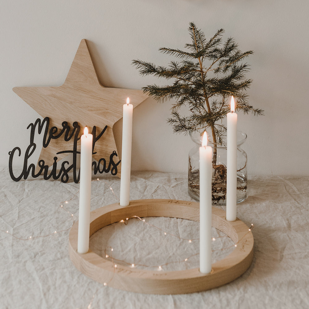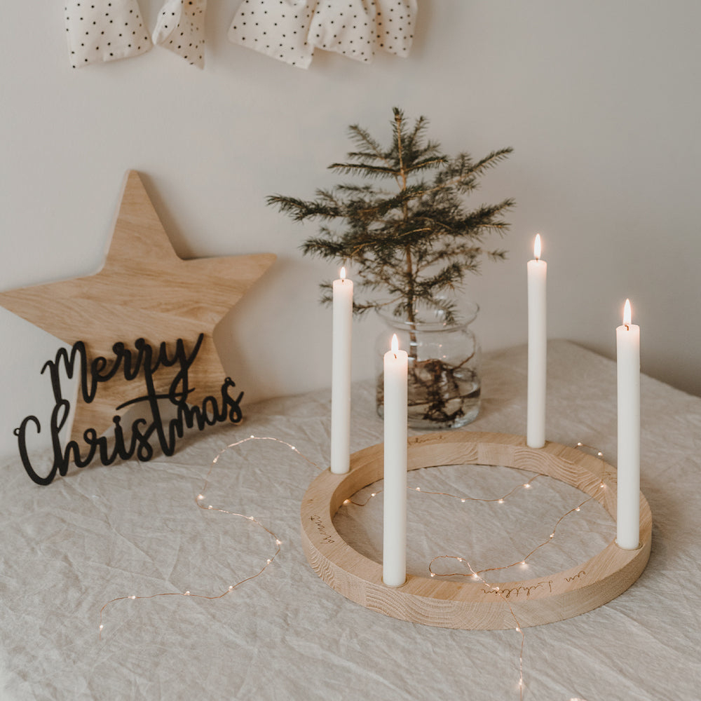 Der Eulenschnitt Adventskranz Eiche ist in der ganzen Adventszeit für Dich da und möchte Dir die dunklen Stunden erhellen. In den goldfarbenen Tüllen ist traditionell Platz für vier Kerzen, die einen Durchmesser von 2,2 cm haben sollten. Der Eulenschnitt Adventskranz misst in der Höhe 4 cm und im Durchmesser 36 cm, das macht ihn sehr stabil, aber Kerzen solltest Du dennoch niemals unbeaufsichtigt lassen.