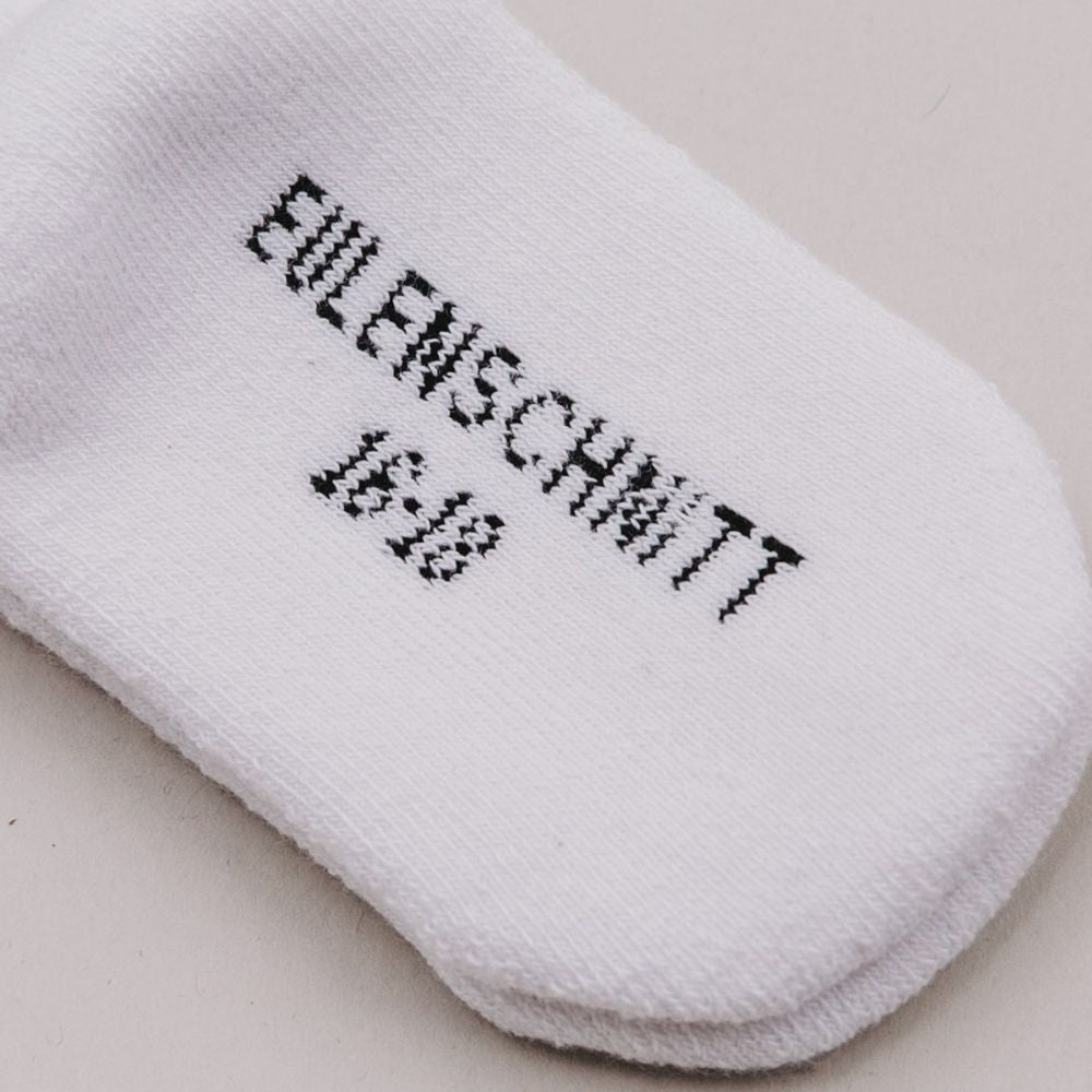 Du hältst die kleinen Babysocken von Eulenschnitt in strahlendem Weiß in der Hand und entdeckst auf der Rückseite, direkt am Hacken, ein süßes schwarzes Herz. Dieses kleine Detail verleiht den Socken eine besondere Wärme und zeigt auf liebevolle Weise, wie viel dir dein kleiner Schatz bedeutet.