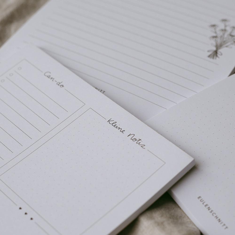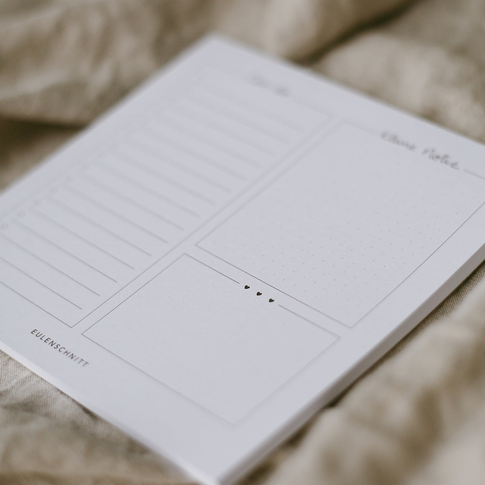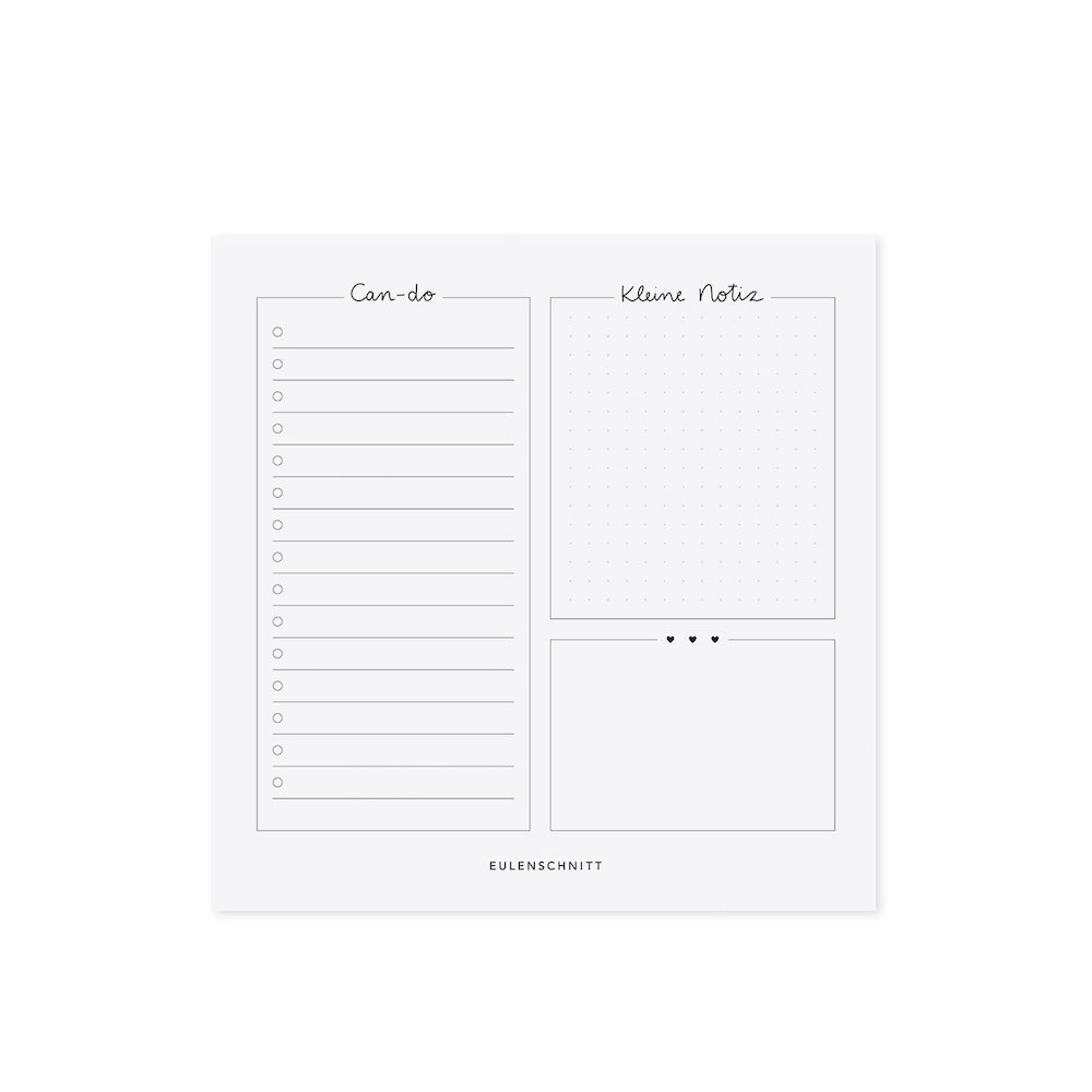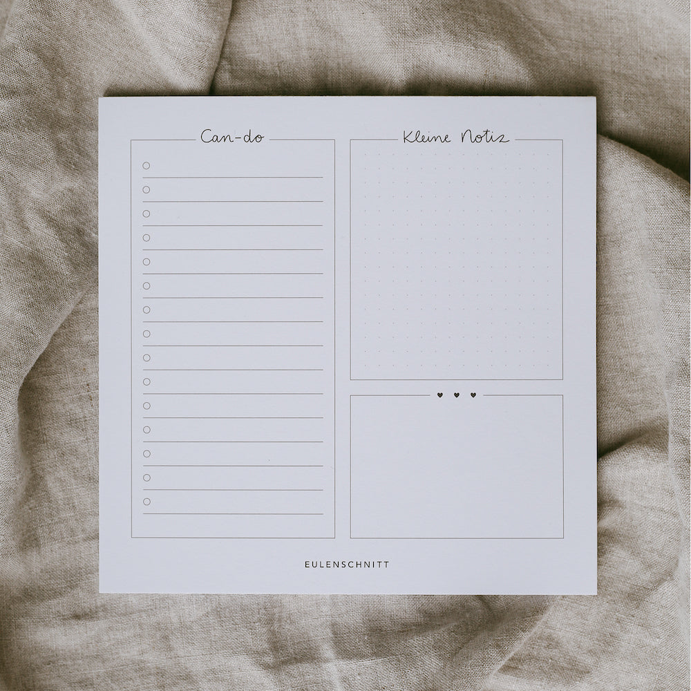 Der Eulenschnitt Block Can-do hilft Dir bei Deinen täglichen Aufgaben und ebenso hilft er Dir dabei, wichtige Dinge nicht mehr zu vergessen. So hast Du auf dem 15 x 15 cm Block auf der linken Hälfte eine lange Spalte für Aufgaben, die Du noch erledigen möchtest und auf der rechten Seite bleibt Platz für Notizen und ein kleiner Kasten für Handgeschriebenes. So bleibt nichts mehr Vergessen und Du kannst Dich auf bis zu 50 Blättern täglich auf Deinen Eulenschnitt Block Can-do verlassen. Das ist nicht nur praktisch, sondern sieht auch noch schön aus.