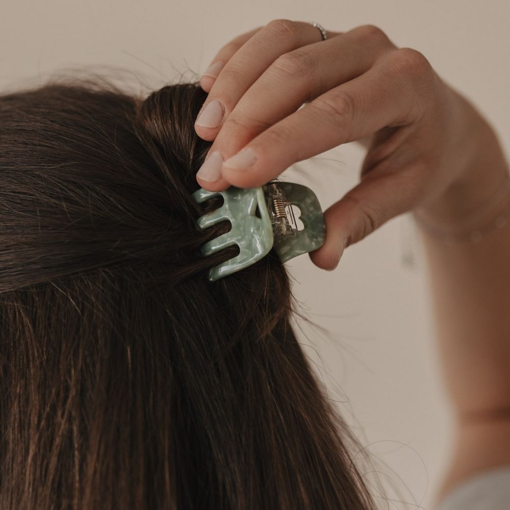 Die Kombination aus der frischen Jadefarbe und dem filigranen Herzdesign macht diese Haarklammer zu einem eleganten und zugleich verspielten Accessoire, das deinem Haarstyling einen modernen Touch verleiht.