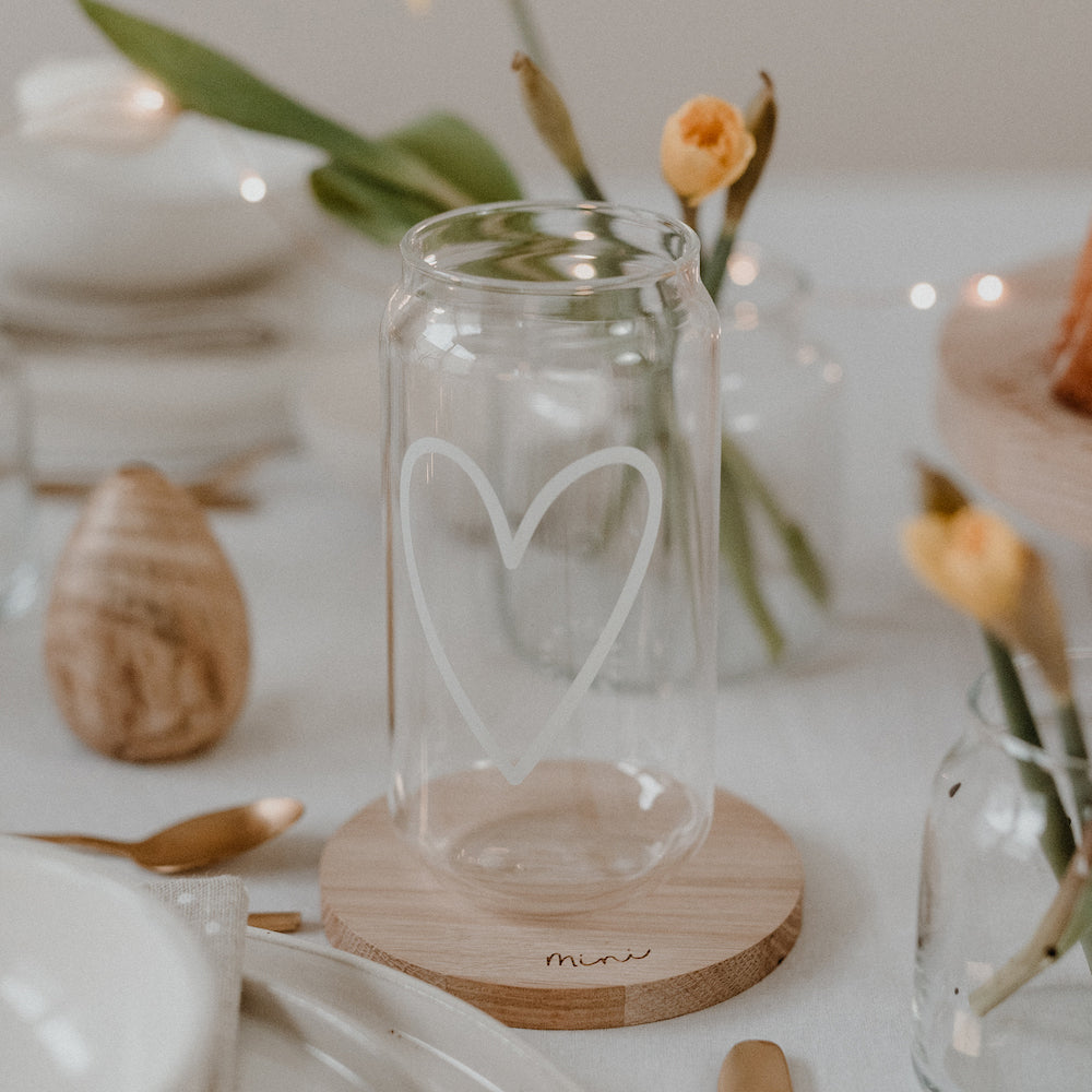 Mit dem großen weißen Herz bringt das hohe Glas von Eulenschnitt sofort gute Laune an den Tisch. In das Glas in Dosenform passen ca. 500 ml Deines Lieblingsgetränkes. Aus robustem Borosilikatglas gefertigt, kann es sogar in der Spülmaschine gereinigt werden. Entdecke die trendigen Küchenaccessoires von Eulenschnitt und lasse Dich begeistern.