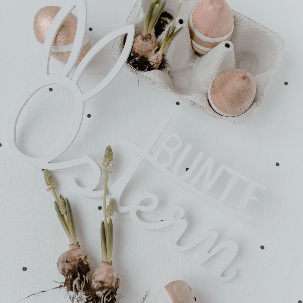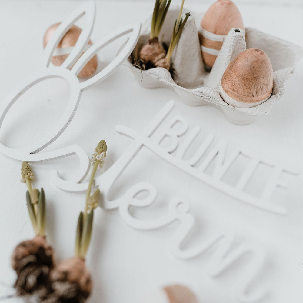 Dieser trendige Schriftzug von Eulenschnitt darf in Deiner Osterdekoration nicht fehlen. Schlicht und trotzdem auffällig zeigt sich der weiße Schriftzug zum Beispiel an Deiner Haustür. Aber auch mit ein paar Trockenblumen geschmückt, findet er auf der Kommode oder der Ostertafel seinen Platz. Wir wünschen eine frohe Osterzeit mit den Produkten von Eulenschnitt.