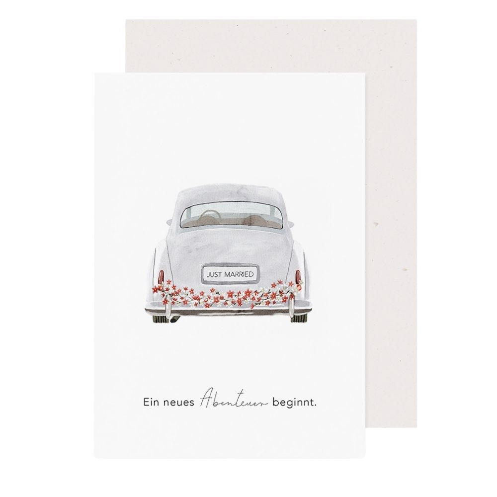Direkt unter dem Motiv findest du den Spruch Ein neues Abenteuer beginnt, der die Karte zu einer ganz besonderen Botschaft macht. Er erinnert daran, dass die Ehe nicht nur ein Versprechen ist, sondern auch der Auftakt zu vielen gemeinsamen Momenten, Entscheidungen und Erinnerungen.