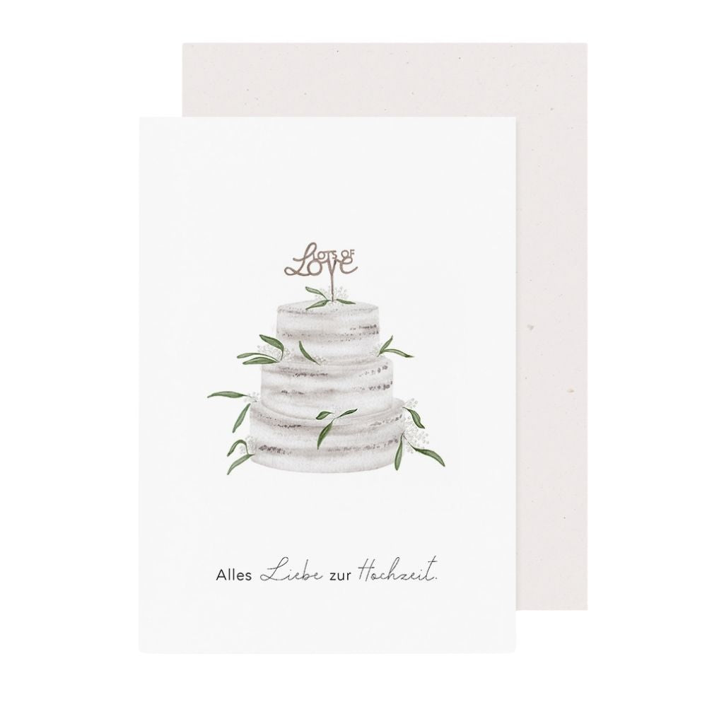 Die Klappkarte Hochzeitstorte von Eulenschnitt ist eine stilvolle und liebevolle Möglichkeit, frisch Vermählten deine Glückwünsche zu überbringen. Auf der weißen Vorderseite steht in feiner Schrift der Gruß Alles Liebe zur Hochzeit. Darunter ist eine elegant illustrierte graue Hochzeitstorte abgebildet, verziert mit zarten grünen Zweigen, die dem Motiv eine natürliche und zugleich festliche Note verleihen.