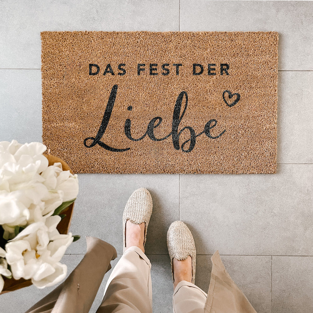 Schon, wenn Du nach Hause kommst, kannst Du den hektischen Einkaufsstress hinter Dir lassen, denn hier begrüßt Dich die Kokos Fußmatte mit dem Aufdruck Das Fest der Liebe von Eulenschnitt. Die Fußmatte aus Kokosfasern ist mit einer Größe von 45 x 75 cm ideal für den Eingangsbereich. Der Rücken aus Vinyl vermindert ein Wegrutschen der Matte. Lasse Dich von unseren trendigen Produkten begeistern.