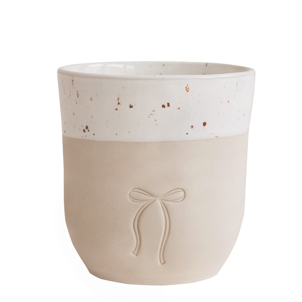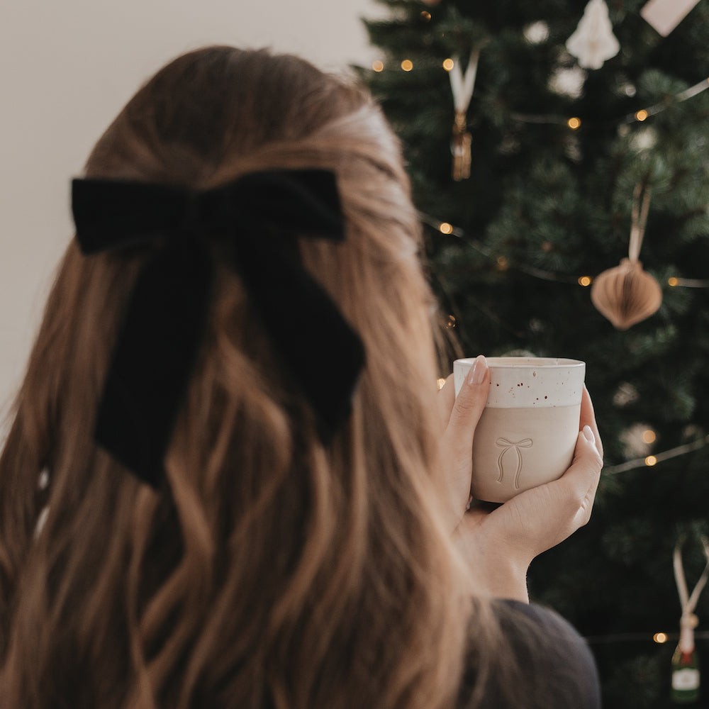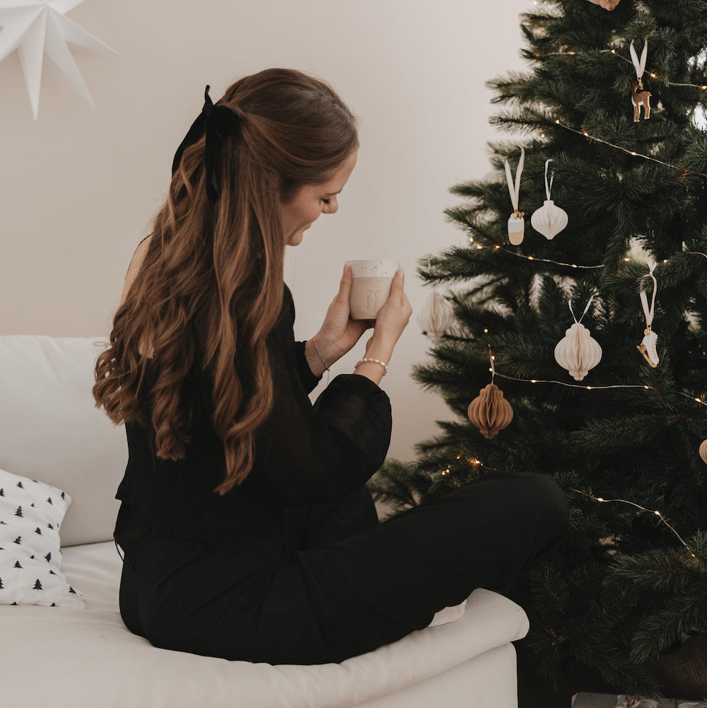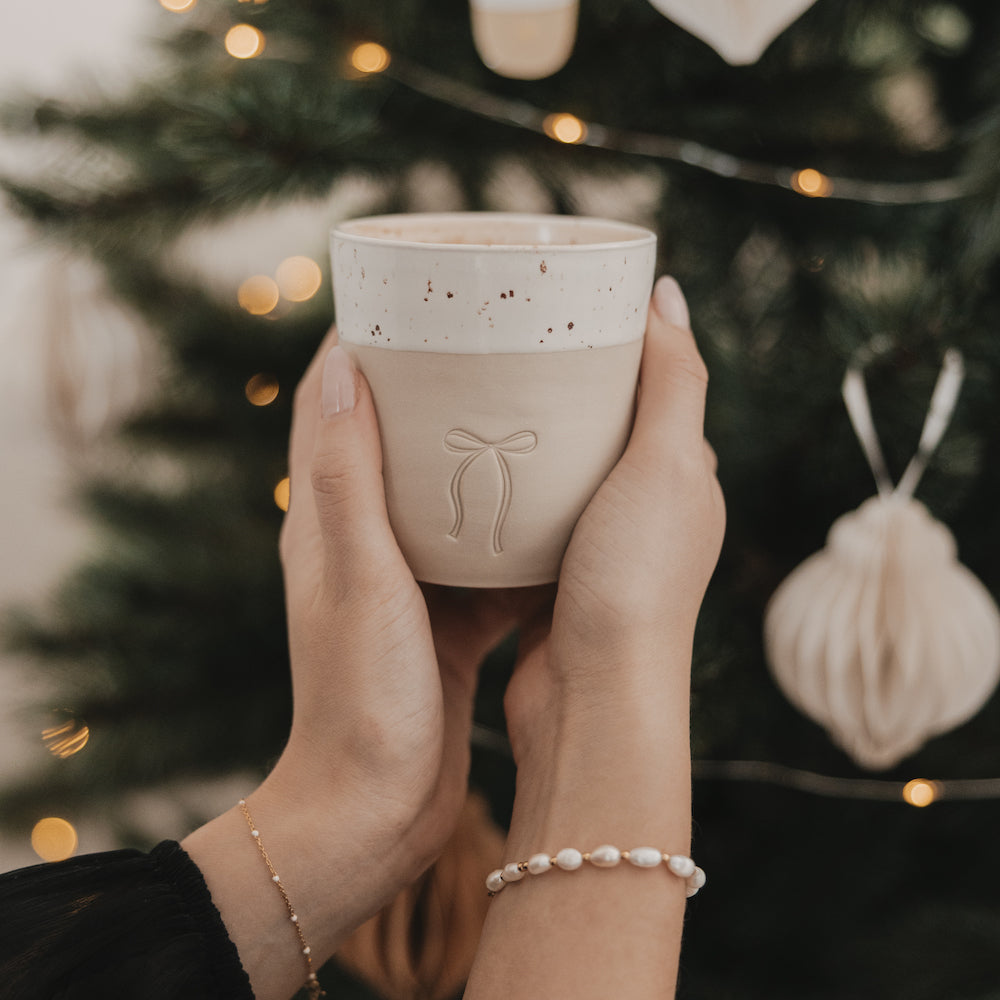 Das trendige Schleifen-Motiv auf der Vorderseite verleiht dem Becher einen eleganten, zugleich verspielten Charakter. Es steht für Geborgenheit, Freude und die kleinen Aufmerksamkeiten, die die Weihnachtszeit so besonders machen. Jeder Becher wird in Handarbeit gefertigt, wodurch kleine Unregelmäßigkeiten in Form, Glasur und Motiv entstehen können – genau diese machen jedes Stück zu einem echten Unikat.