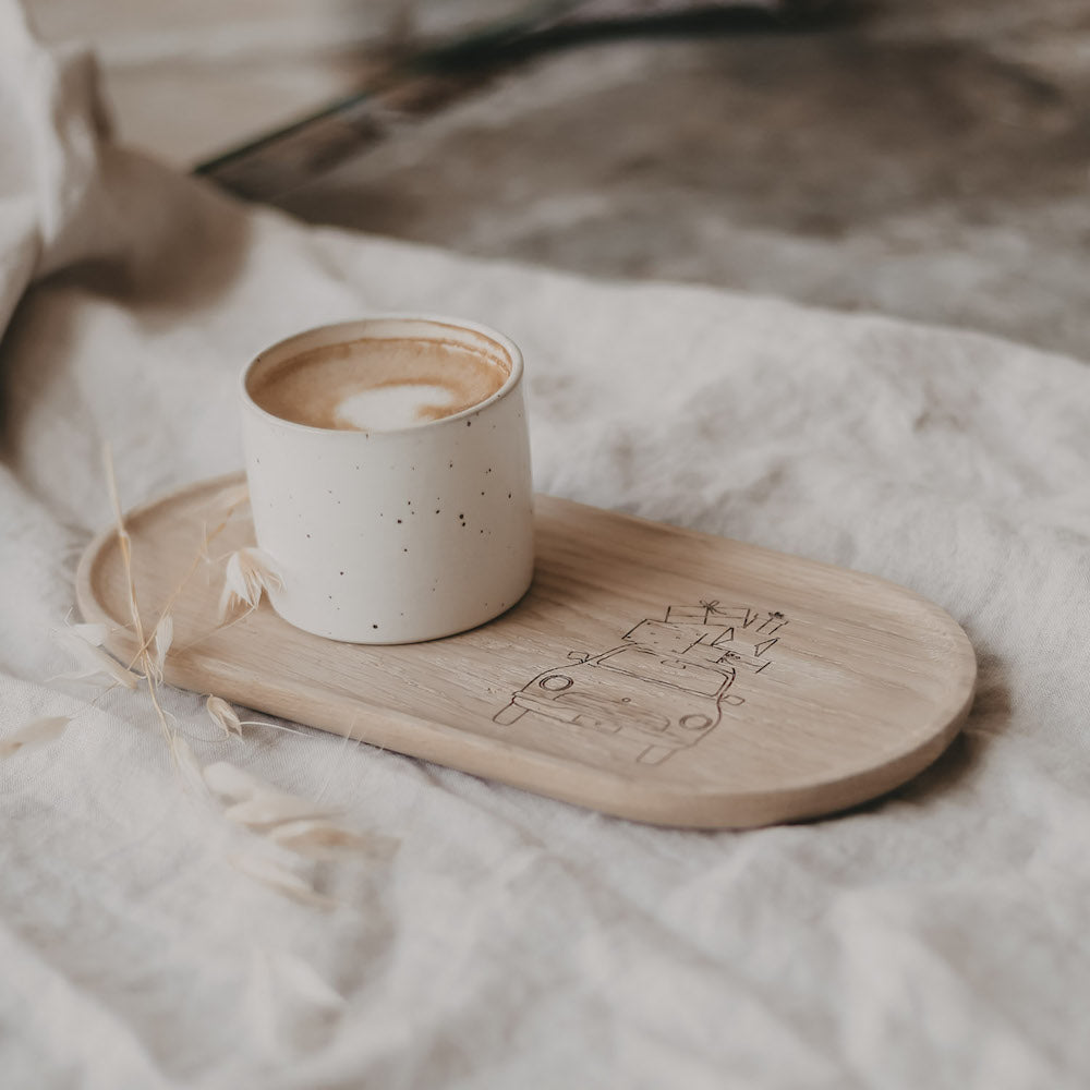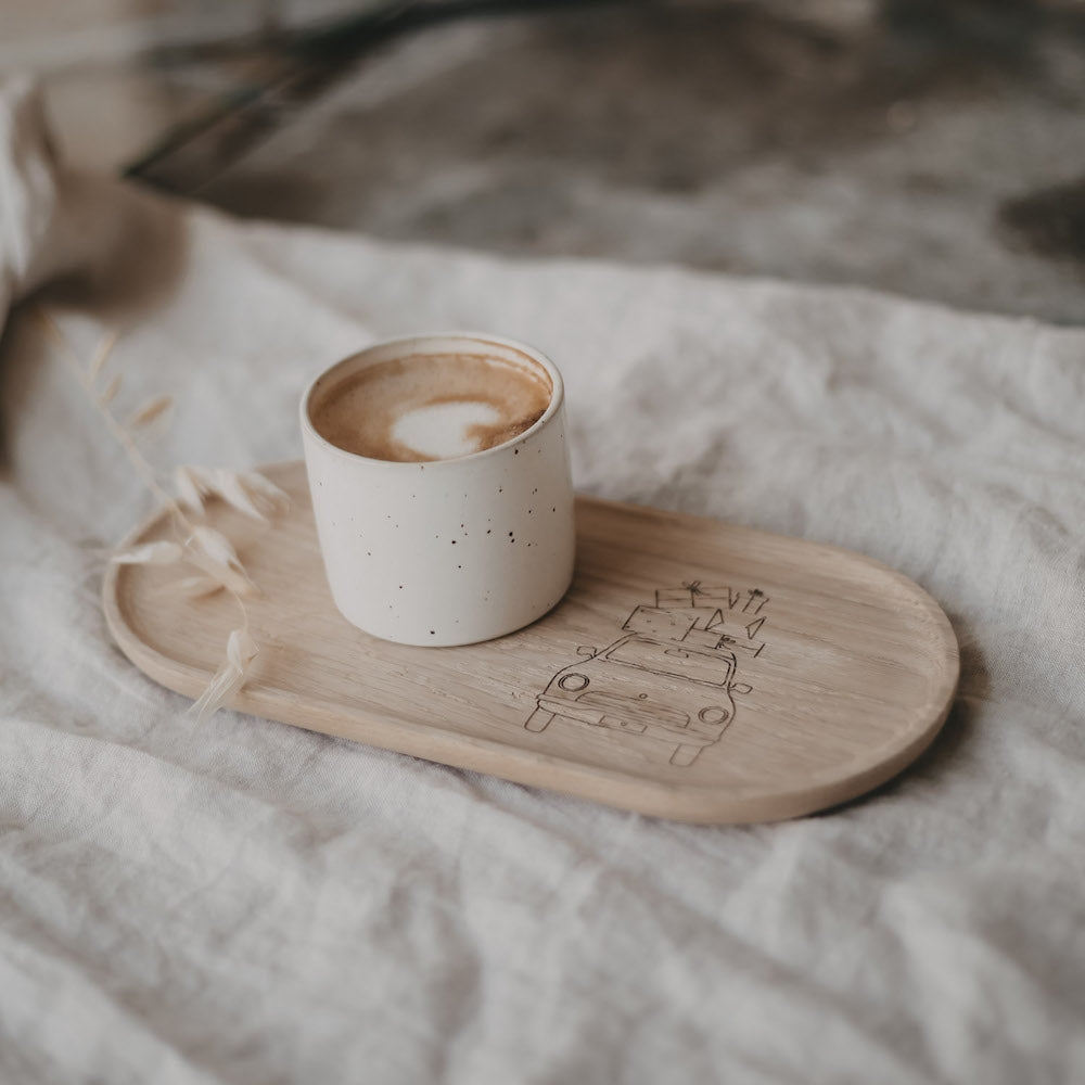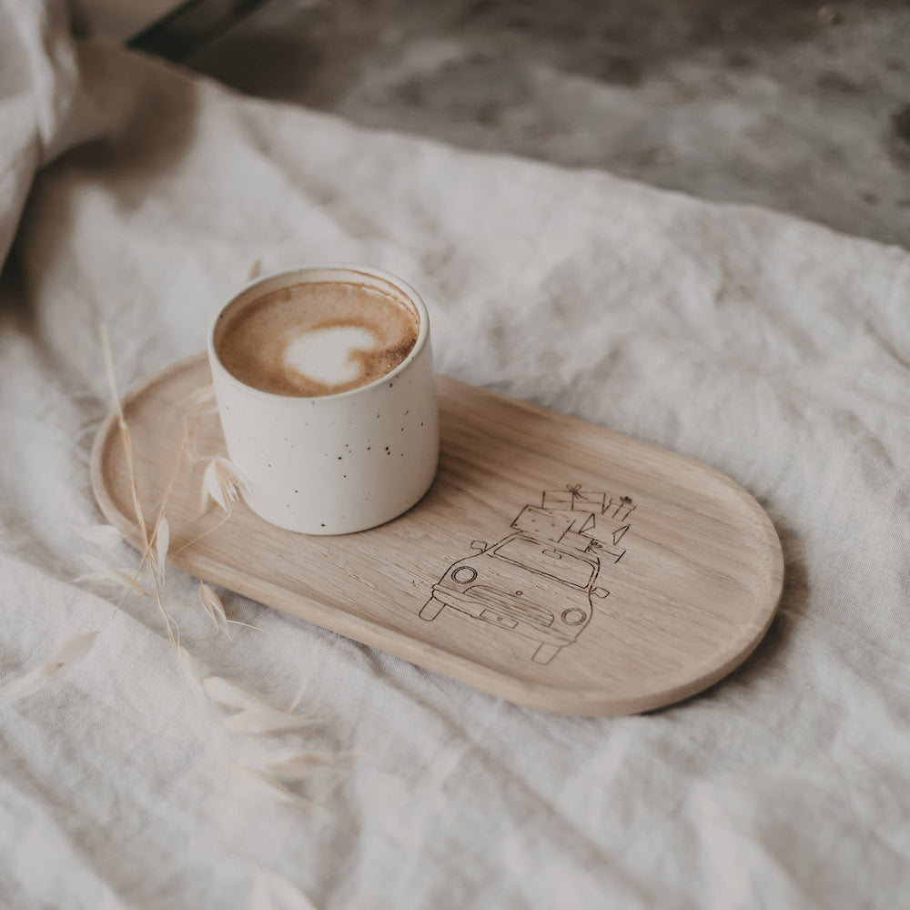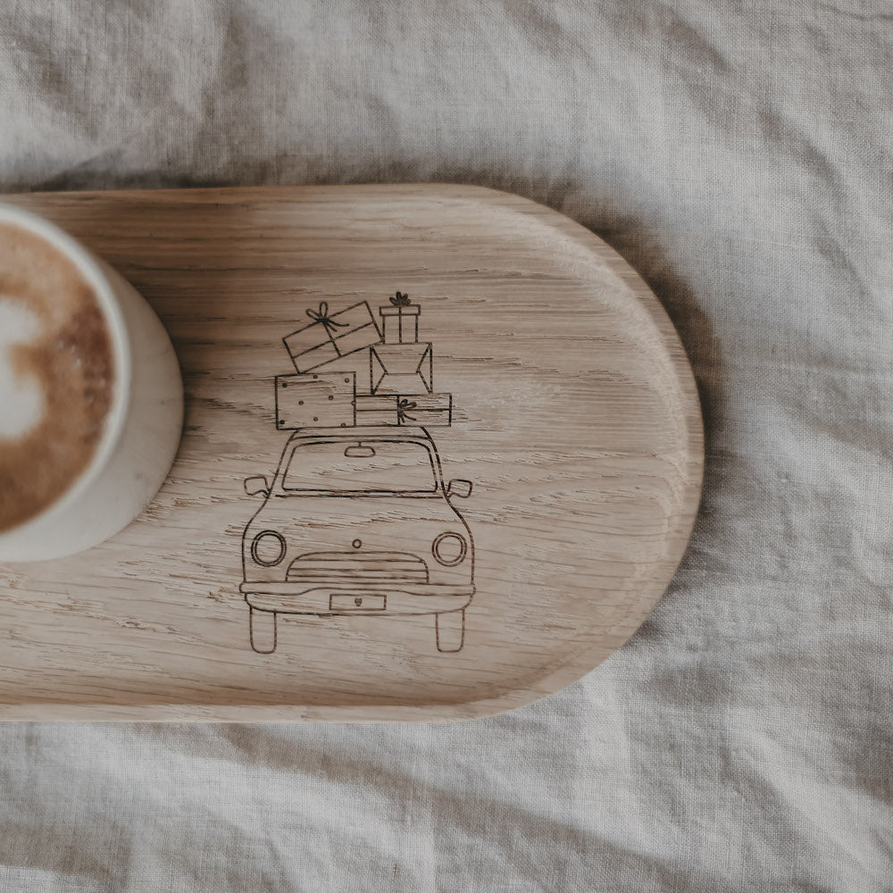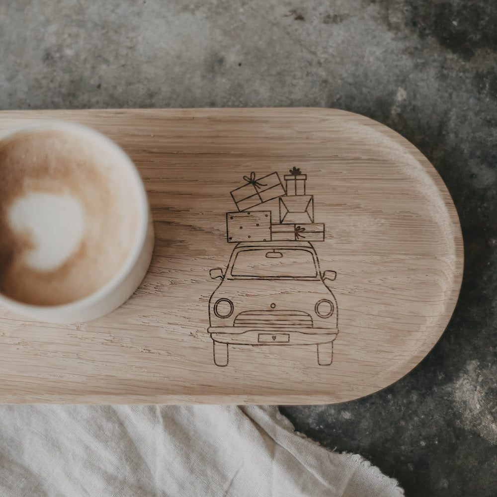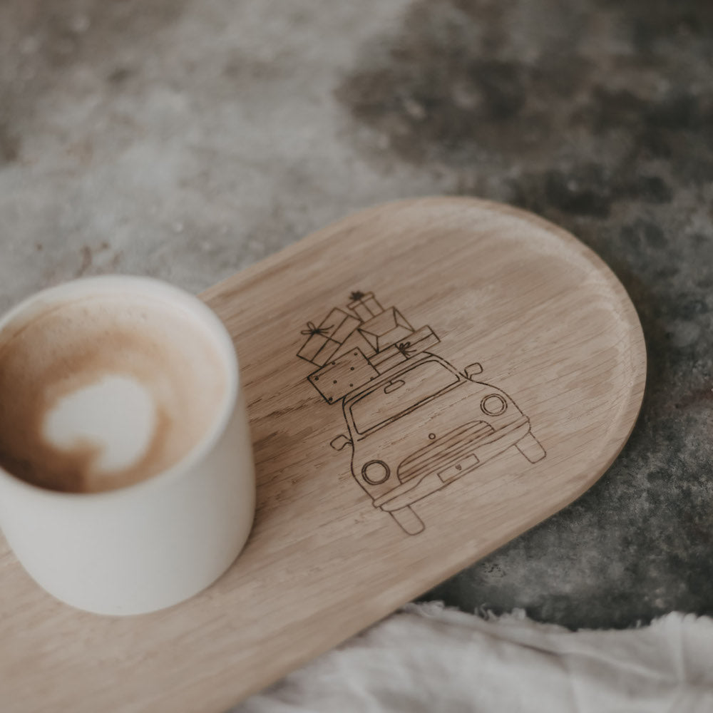Weihnachten ist, wenn die Familie mit dem Auto vorfährt, um fröhliche Stunden miteinander zu verbringen. Dieses wundervolle Mini Tablett aus Eichenholz vervollständigt Deine festlich gedeckte Tafel und begrüßt Freunde und Familie. Das schlichte Design und die bedeutungsvolle Botschaft machen das kleine Tablett von Eulenschnitt zu einem dekorativen Element in Deinem Zuhause.