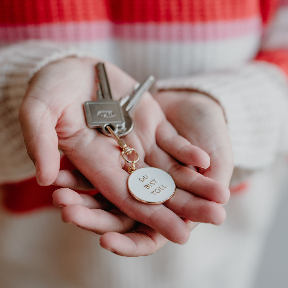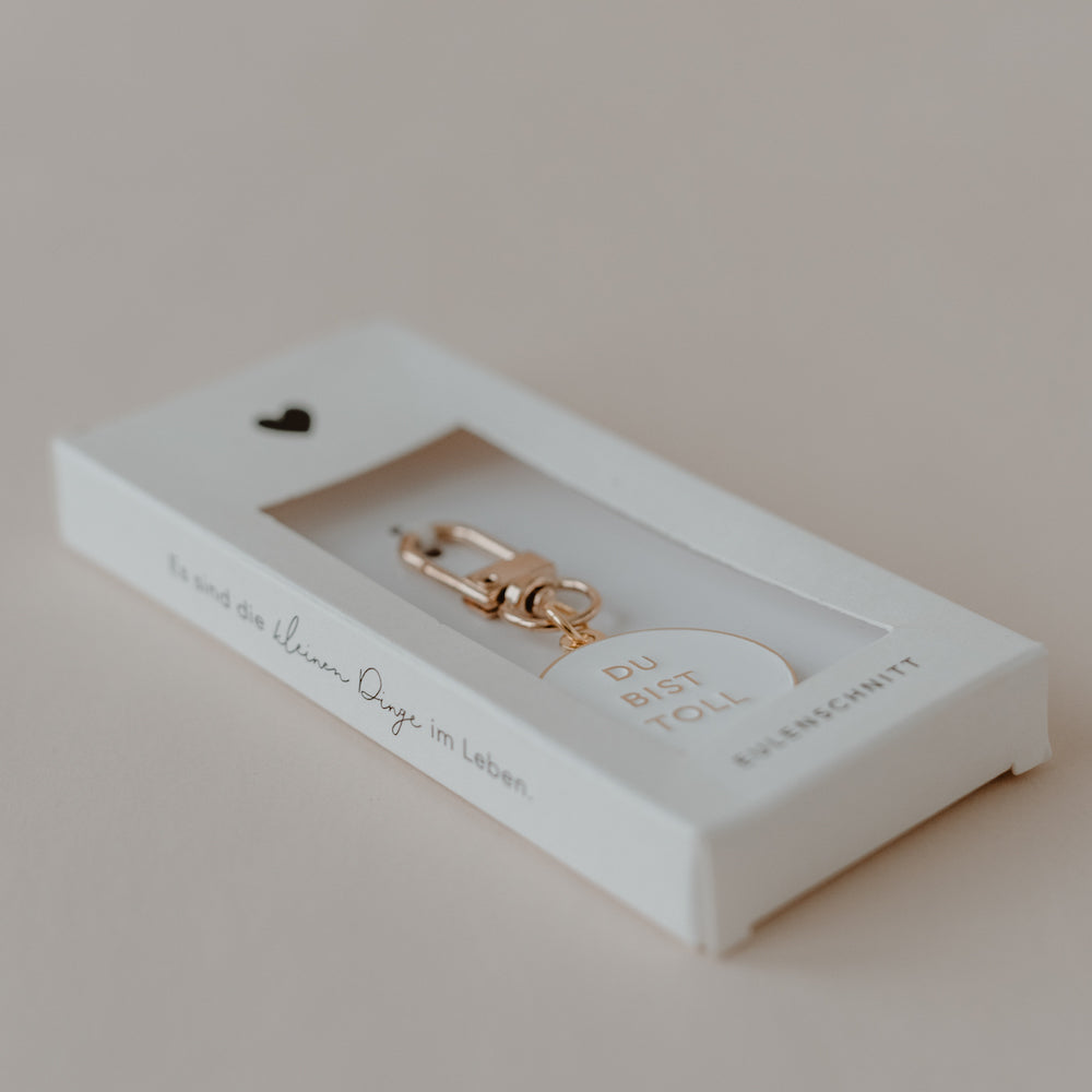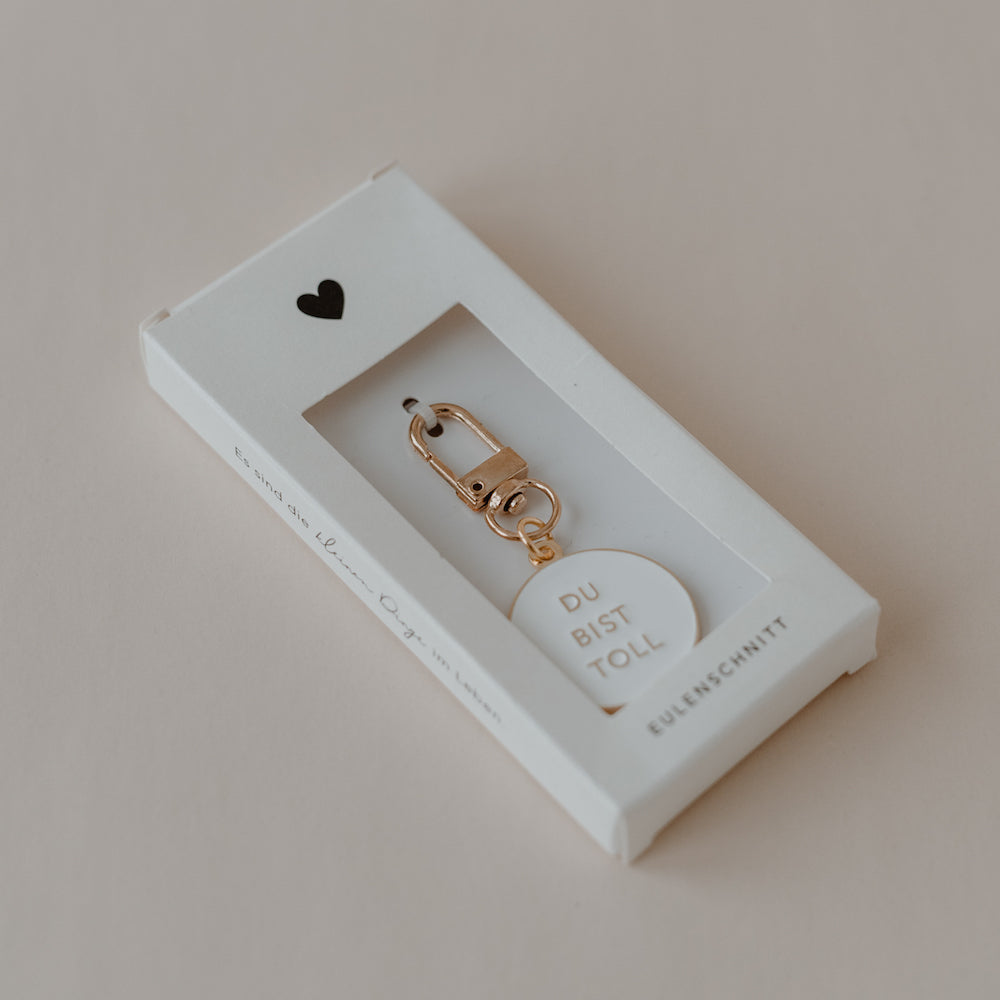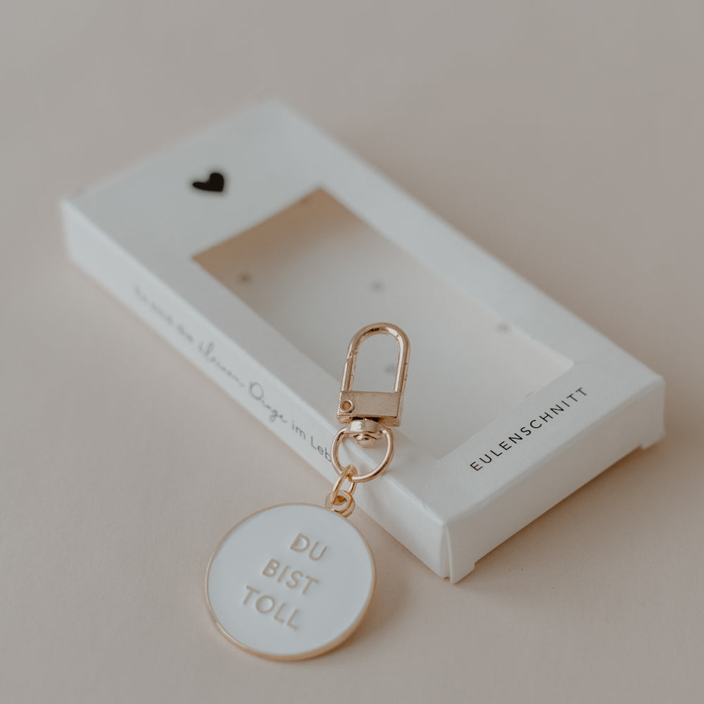 Mit dem Eulenschnitt Schlüsselanhänger Du bist toll, bereitest Du jemandem eine ganz besondere Freude. Egal wohin dieser tolle Mensch geht, ein Stück von Dir trägt er oder sie immer bei sich! Mit dem weißen Eulenschnitt Anhänger aus Metall sind der Haustürschlüssel, der Schlüssel zum Briefkasten oder für das Fahrrad immer griffbreit.