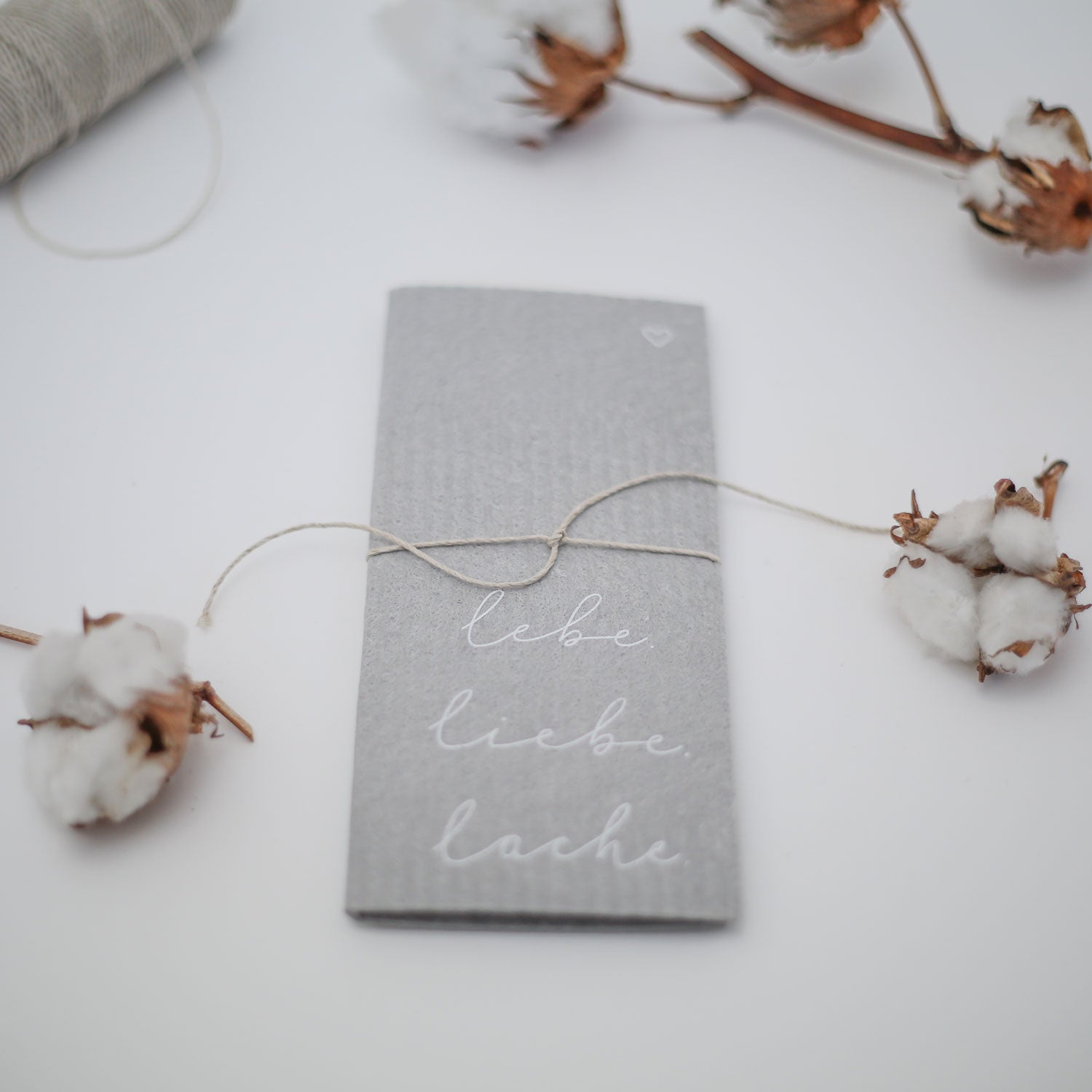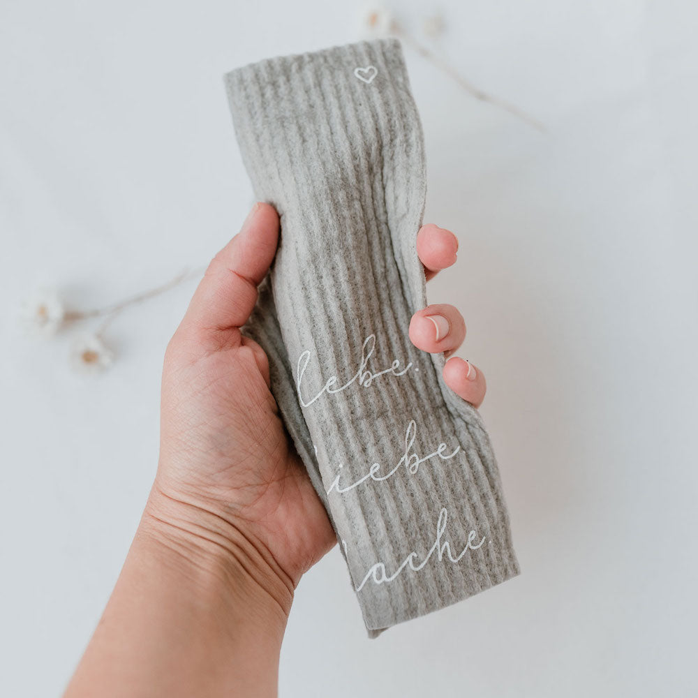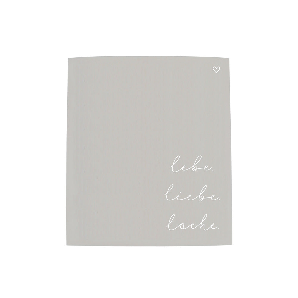 Du hast genug von Eintönigkeit in Deiner Küche? Dann bringen dir die Schwammtücher `lebe. Liebe. Lache.´ von Eulenschnitt die ersehnte Abwechslung und das sogar im 3er-Set! Die Tücher in angesagtem Hellgrau sind mit einem handgeschriebenen Schriftzug in Weiß bedruckt. Dass nicht nur das Design zählt ist selbstverständlich, also was macht die Schwammtücher zu perfekten Küchenhelfern? Sie lassen sich bei 95°C waschen, sind besonders saugfähig, fusselfrei und dabei auch noch nachhaltig, dank kompostierbarem Mix aus 70% Cellulose und 30% Baumwolle – was will man mehr? Bei uns im Shop gibt es auch noch weitere Schwammtücher zu entdecken.