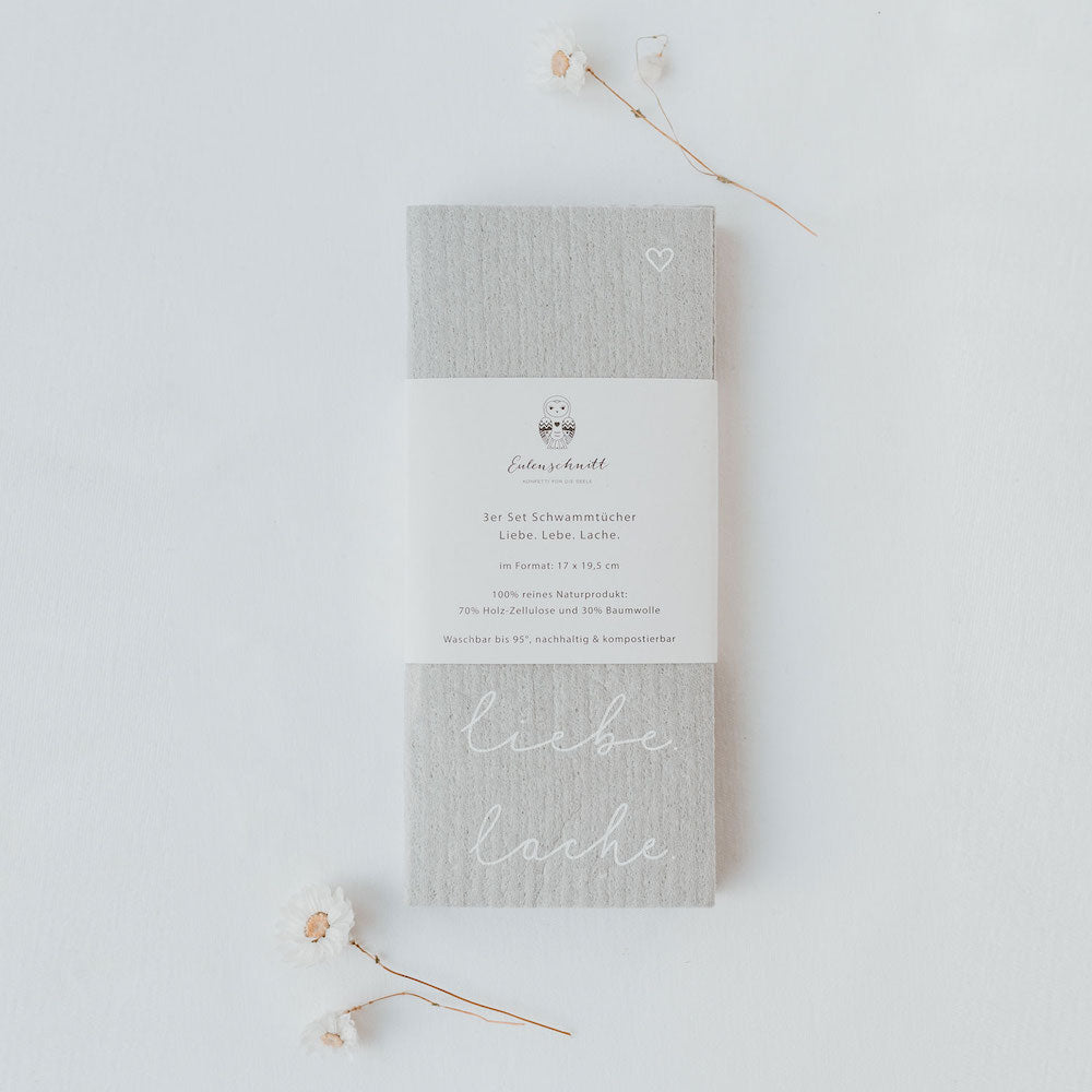 Eulenschnitt Schwammtücher Lebe – Liebe – Lache 3er-Set grau