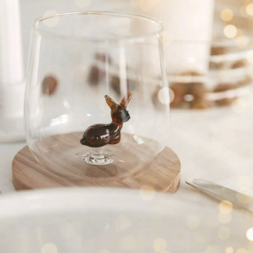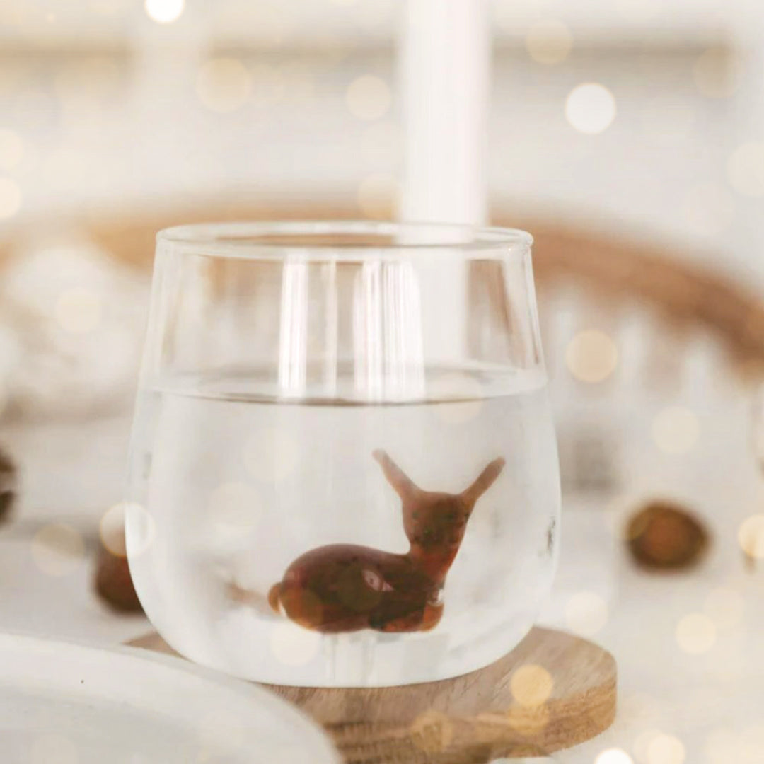 Du hältst ein besonderes Trinkglas von Eulenschnitt in der Hand, klar und schlicht im Design, doch im Inneren verbirgt sich eine kleine Überraschung. Am Boden des Glases sitzt eine detailreiche Rehfigur in warmem Braunton, fest im Glas verankert und sichtbar von allen Seiten. Die Figur wirkt fast lebendig, als würde sie still im Morgentau eines Waldes stehen. Durch den 3D‑Effekt scheint das Reh je nach Blickwinkel zu schweben oder auf dem Grund deines Getränks zu ruhen.