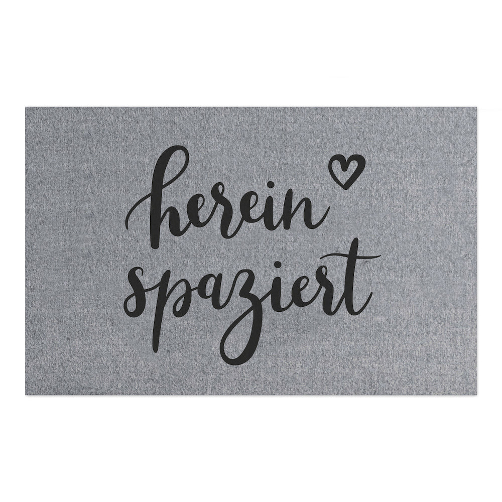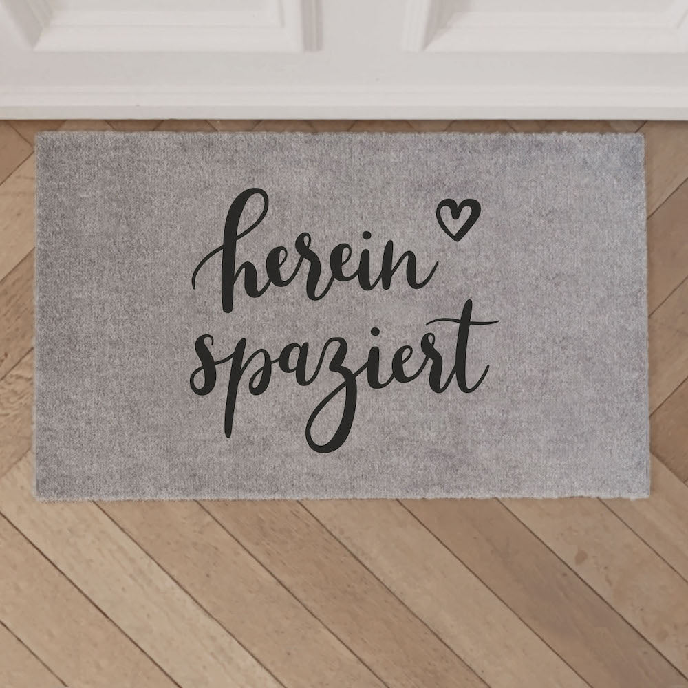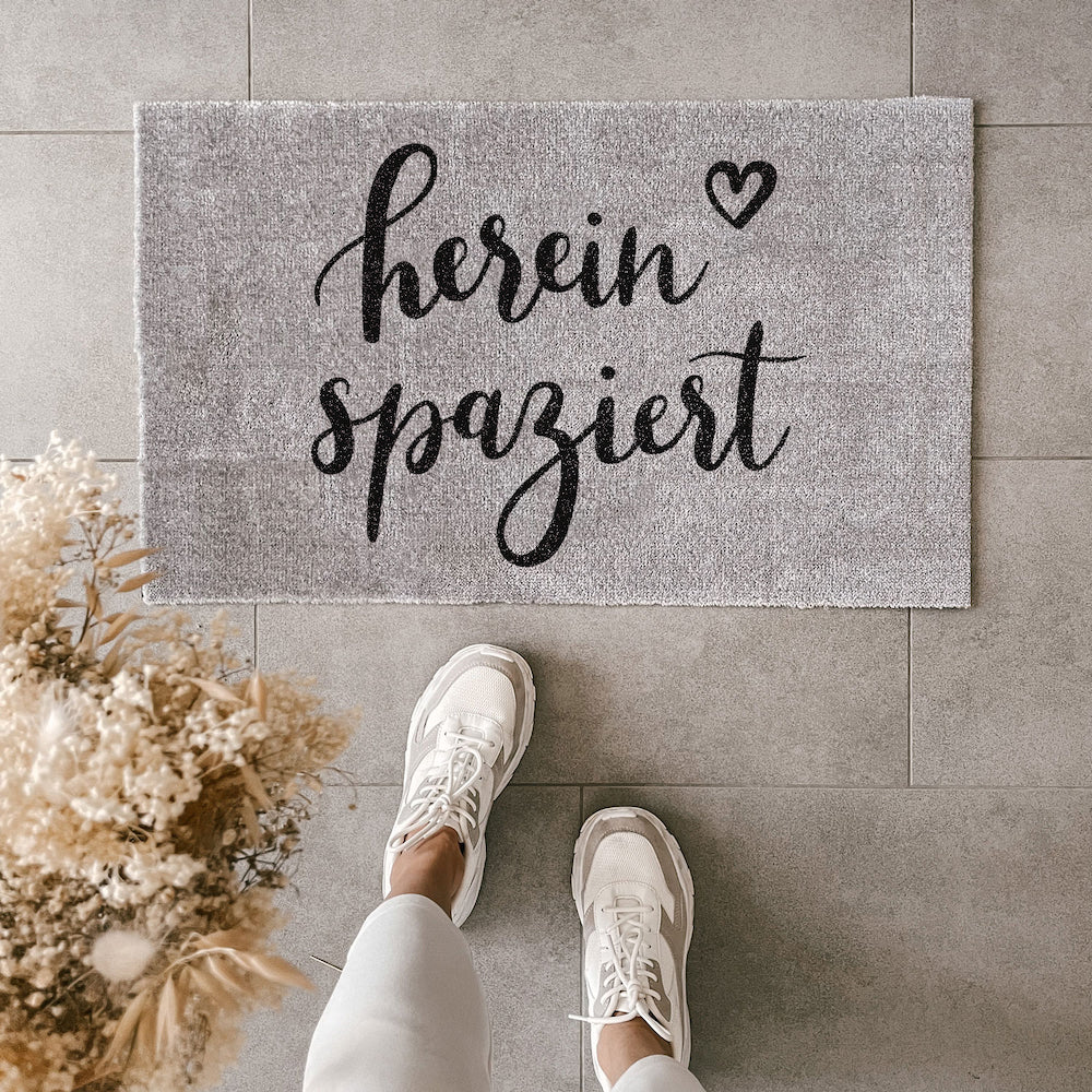Die graue Fußmatte Hereinspaziert von Eulenschnitt ist das Must-have für Deine heimische Wohnfühloase. Das schwarz-graue Design passt zu jedem Einrichtungsstil und sorgt mit seinem handgeschriebenen Spruch für gute Laune. Die Polyamidfasern machen die Matte dabei nicht nur robust, sondern fühlen sich auch noch besonders weich an Deinen Füßen an: Perfekt zum Barfußgehen! Die Rückseite besteht aus rutschfestem PVC, so bleibt der Vorleger garantiert an Ort und Stelle. Entdecke noch mehr Einfallsreiches von Eulenschnitt hier bei uns!