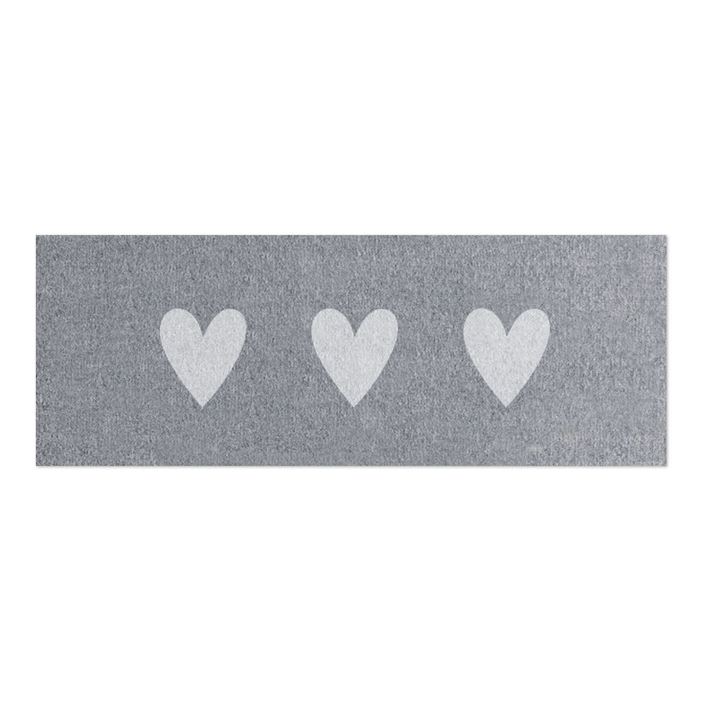 Herzlich willkommen liebe Gäste! Die waschbare Fußmatte Herzen grau klein von Eulenschnitt versprüht eine ganze Menge gute Laune und positive Energie. Die drei kleinen weißen Herzen auf dem grauen High Twist Polyamid sind ein toller Kontrast. Wenn das mal nicht die perfekte Fußmatte für deinen Eingangsbereich im Innen- oder Außenbereich ist. Die Türmatte ist ca. 25 x 75 cm groß und besteht auf der Rückseite aus rutschfestem PVC. So bleibt der Türvorleger garantiert an Ort und Stelle. Du bist begeistert? Dann schau dir bei uns im Shop doch noch die anderen Designs von Eulenschnitt an.