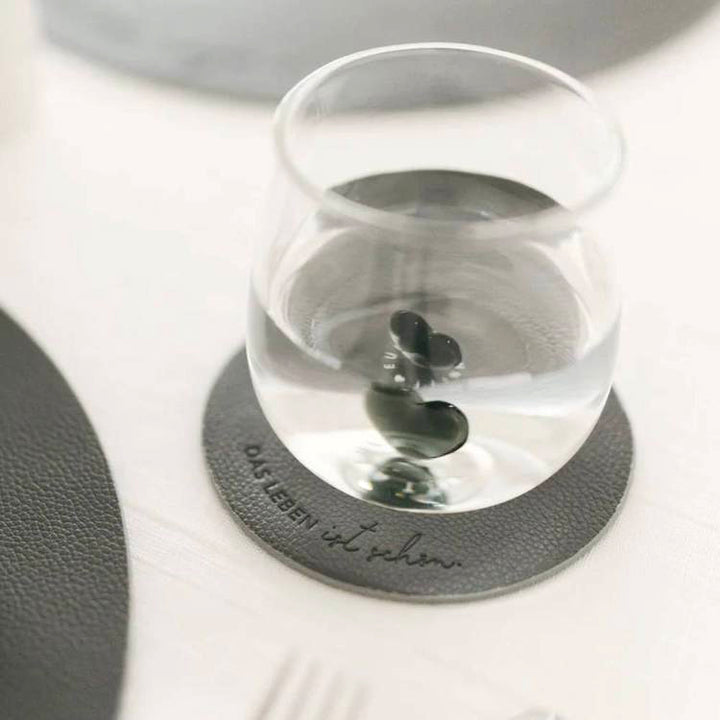 Besonders toll ist das wendbare Design der Untersetzer. Auf der dunkelgrauen Seite findest du den positiven Schriftzug „Das Leben ist schön“, der sofort gute Laune verbreitet. Die hellgraue Rückseite ziert ein zartes, für Eulenschnitt typisches Herzchen. So kannst du je nach Stimmung, Anlass oder Tischdekoration flexibel entscheiden, welche Seite heute zum Einsatz kommt.