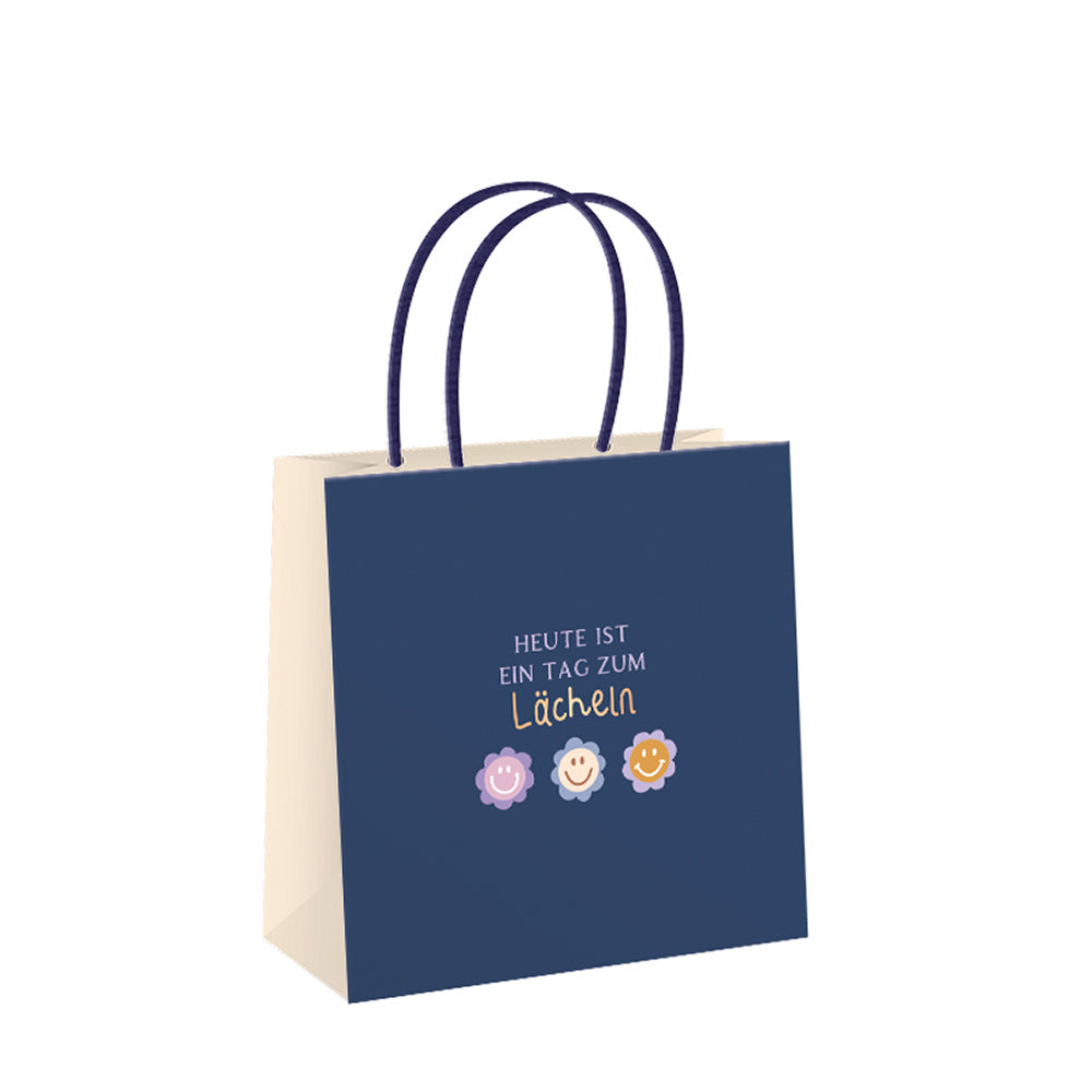 Mit dieser Geschenktüte kannst Du auf knittriges Geschenkpapier und verknotetes Band gut verzichten. Verschenke kleine Aufmerksamkeiten in der 12,3 x 12,5 cm großen Papiertüte mit Goldveredlung, denn heute ist ein Tag zum Lächeln!
