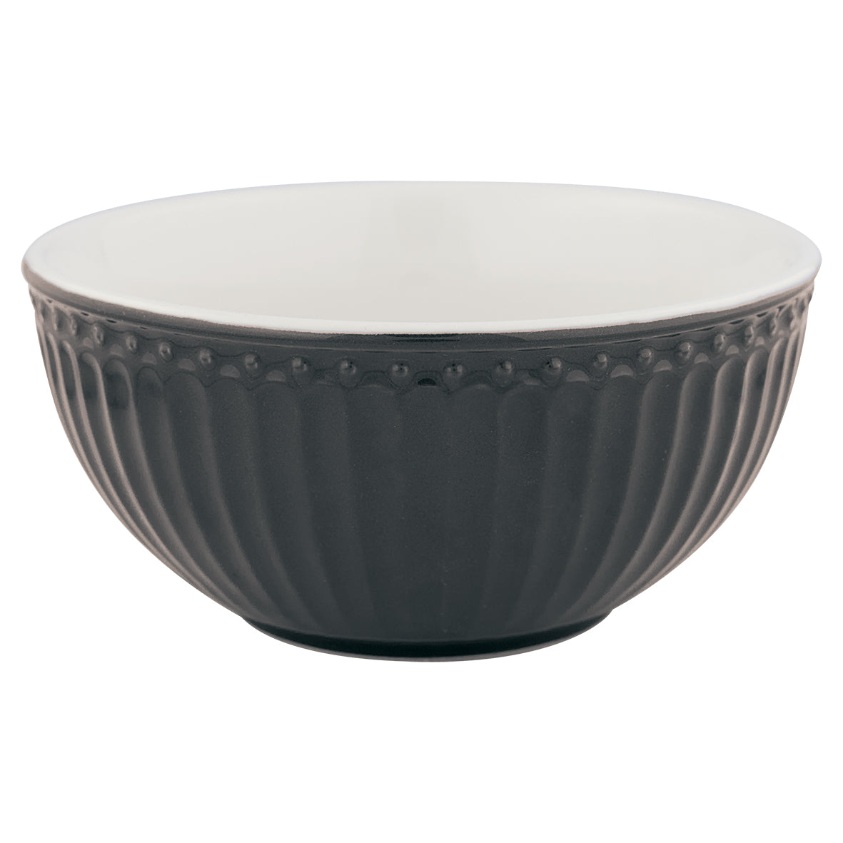 Die Müslischale Alice von Greengate in Dunkelgrau ist perfekt für den Start in den Tag, die Mittagspause oder den Snack am Abend. Ob du darin deine Bowl Müsli genießt oder die Schale zum Filmeabend bis oben hin mit Popcorn füllst – Alice ist immer eine gute Wahl. Die elegante Struktur auf der Außenseite macht sie zu einem echten Hingucker und lässt sie sich auch schön als Dekorationsstück auf der Anrichte integrieren. Mit einem Stück Steckschaum ausgestattet, lässt sie sich mit wenigen Handgriffen in eine Blumenschale verwandeln. Lass dich von den zauberhaften Produkten von Greengate aus unserem Shop begeistern.