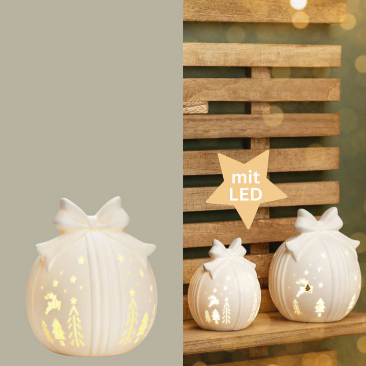 Diese kleine LED Lichtkugel in Weiß erinnert in ihrer Form an ein liebevoll verpacktes Geschenk und bringt stimmungsvolles Licht in deine Winterdekoration. Mit filigran eingestanzten Sternen Tannen und Rentieren verziert erzeugt sie beim Einschalten ein sanftes Leuchten das die Motive wunderschön hervorhebt und eine warme ruhige Atmosphäre schafft.