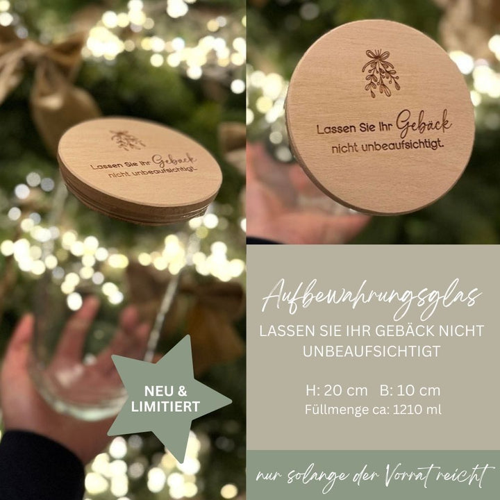 Das durchsichtige Aufbewahrungsglas mit dem liebevoll gestalteten Buchenholzdeckel samt feiner Lasergravur bringt eine festliche, warme Note in jede Küche. Ideal für frisch gebackene Plätzchen, duftende Kekse oder kleine Naschereien und trotzdem gilt: Gebäck besser nicht unbeaufsichtigt lassen! Dieses charmante Glas zieht Blicke magisch an.