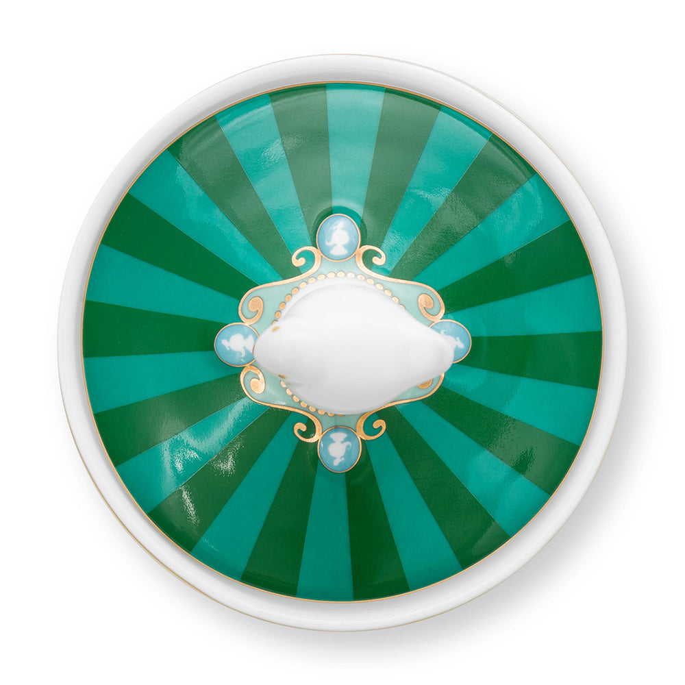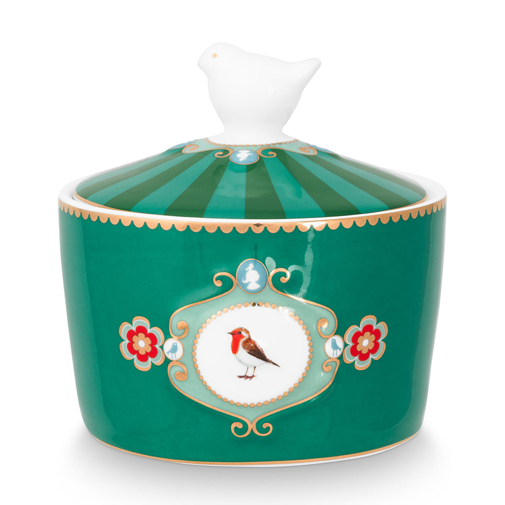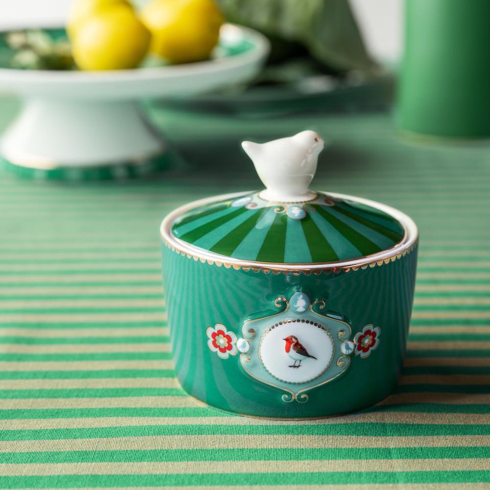 Zur grünen Love Birds Kollektion von Pip Studio gibt es hier die passende Zuckerdose. Auf grünem Grund findest du ein fein verziertes Medaillon mit einem wunderschönen Rotkehlchen in der Mitte. Natürlich dürfen auch die für Pip typischen goldfarbenen Details auf dem Porzellan nicht fehlen. Verliebe auch Du Dich in die neue Love Birds Kollektion von Pip Studio.