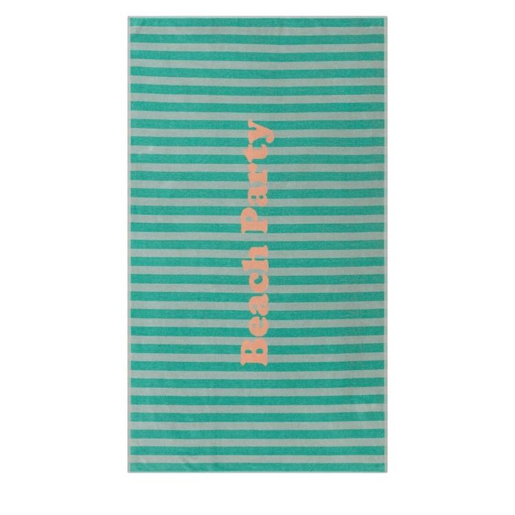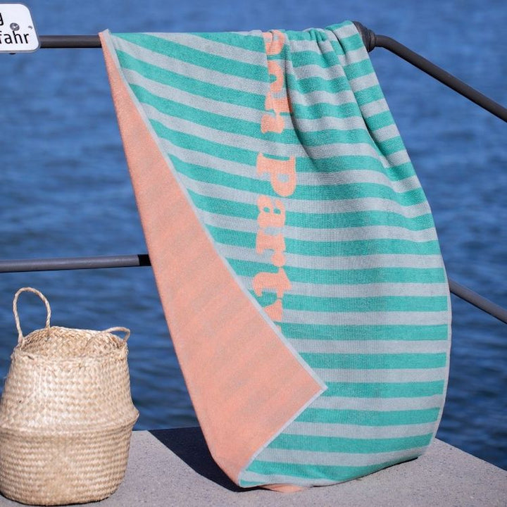 Dieses Strandtuch erzählt den Sommer in sanfteren Tönen. Die mintfarbenen Flächen treffen auf grau-grün gestreifte Elemente und schaffen gemeinsam eine ruhige, fast natürliche Stimmung – wie ein Tag am Meer, an dem eine leichte Brise durch die Luft zieht. Der Schriftzug „Beach Party“ in warmem Aprikot setzt dazu einen weichen Farbakzent, der das Design belebt, ohne sich in den Vordergrund zu drängen.