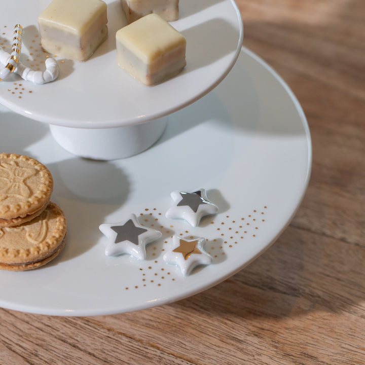 Verziere die Etagere noch mit den beigefügten goldfarbenen Sternchen und Du und Deine Gäste werden sich gar nicht entscheiden können, wohin sie zuerst schauen sollen. Auf die süßen Leckereien oder die detailreiche Etagere, auf die Du sie gelegt hast?