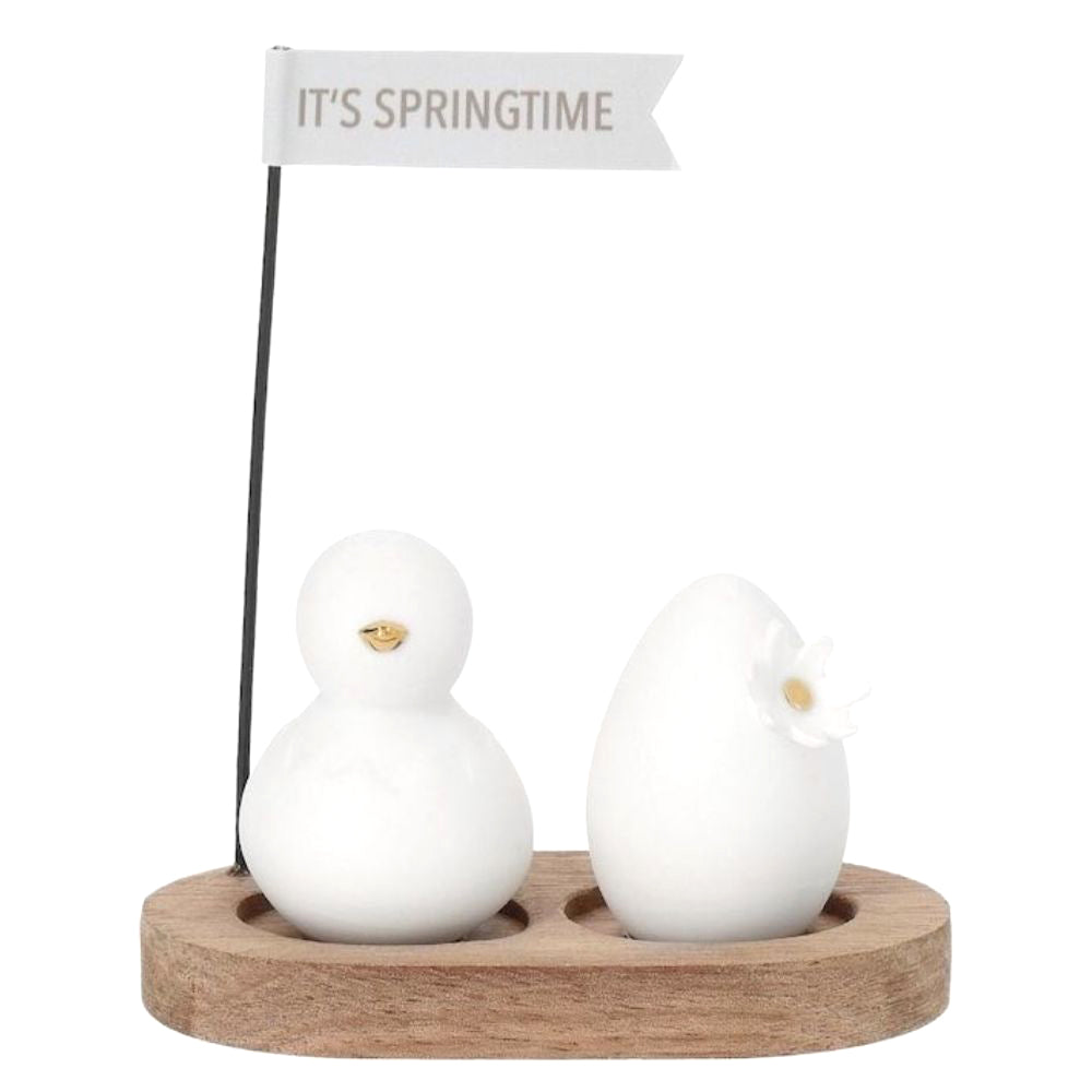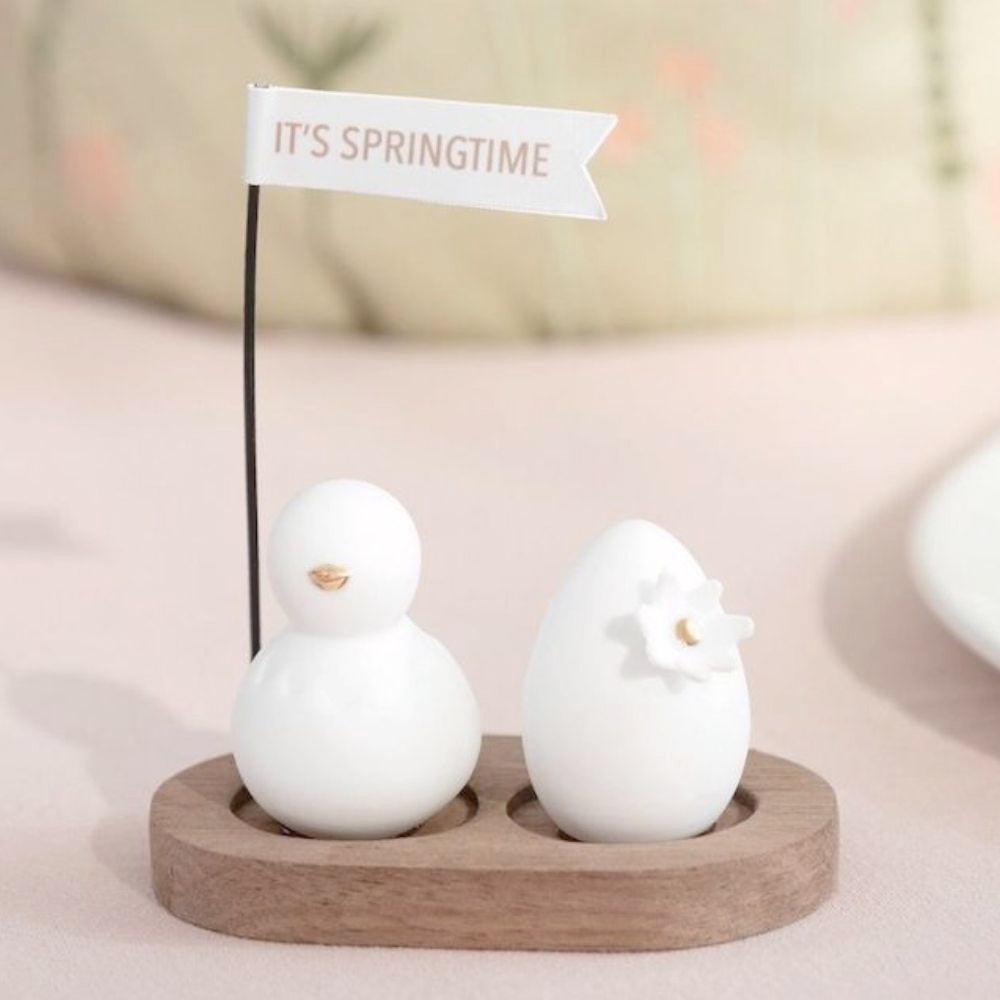 Die Kombination aus feinem Porzellan, goldfarbenen Details und dem warmen Holz des Tabletts schafft ein stimmiges Gesamtbild, das Eleganz und Natürlichkeit vereint. Mit einer handlichen Größe von 7 x 4,3 x 8 cm lässt sich das Set flexibel platzieren und in jede Frühlings- oder Osterdekoration integrieren.