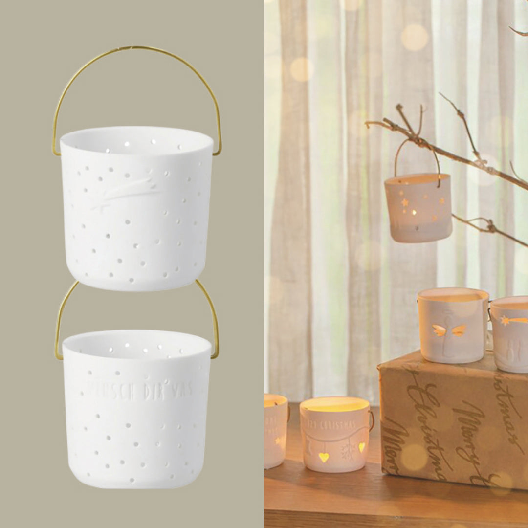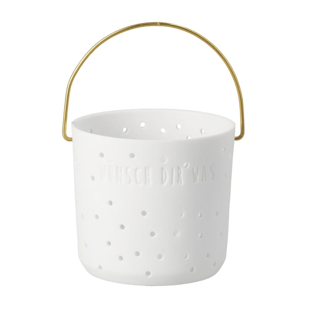 Wenn dann noch ein Teelicht oder ein LED in der Laterne leuchtet, dann erstrahlt die Aufforderung, sich etwas zu wünschen in warmen Licht, das durch die kleinen Löcher der Porzellanlaterne dringt.