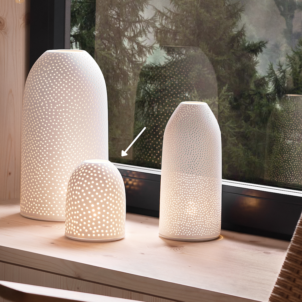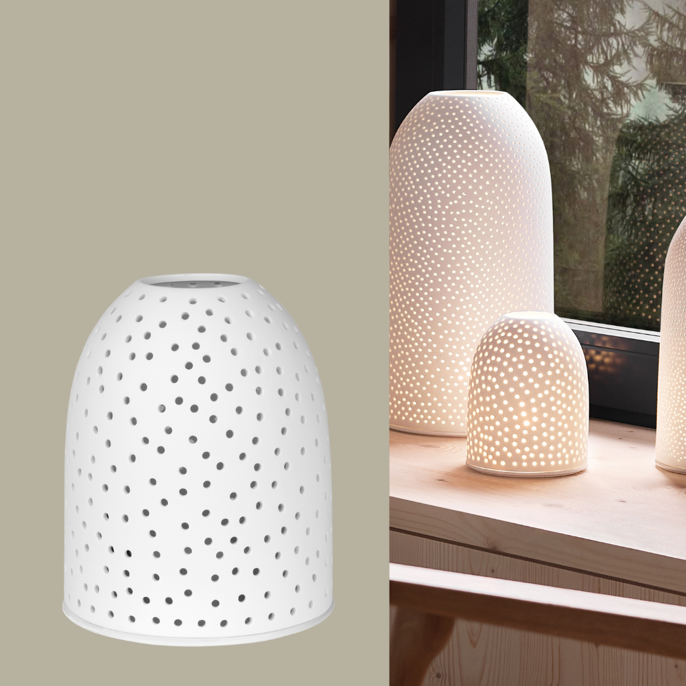 Dieses weiße Himmelszelt von Räder darf in Deiner Adventsdekoration nicht fehlen. Durch die unzähligen kleinen Löcher schimmert das Kerzenlicht wie ein Sternenhimmel in der Nachtl. Die 15 cm hohe Laterne wurde aus unglasiertem Porzellan gefertigt und wirkt am besten mit einer kleinen Lichterkette im Inneren. Probiere es gleich aus und lasse Dich von den leuchtenden Räder-Produkten verzaubern.