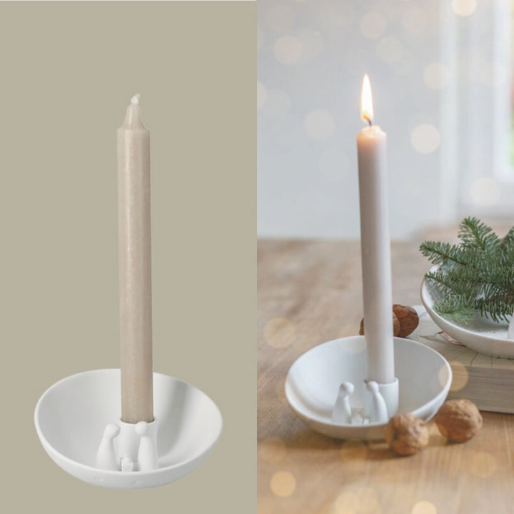 So wie diese Kerzenschale aus unglasiertem Porzellan mit Relief und Porzellanelementen. Stecke eine Kerze (nicht im Lieferumfang enthalten) in die Halterung und zünde sie an. Dann fällt sanftes Licht über die Geburtsnacht Jesu, wie von dem Weihnachtsstern beschienen.