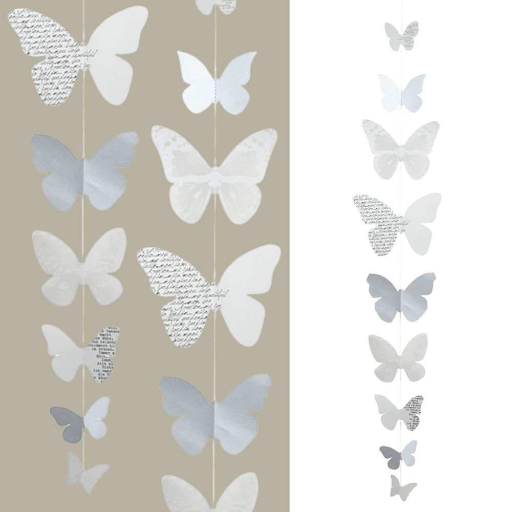 Frühlingsgefühle ziehen mit der schicken Räder Kette dank der großen Schmetterlinge bei Dir Zuhause ein. Sei es vor dem Fenster, im Eingangsbereich oder am Spiegel, die vielen Schmetterlinge sind einfach ein harmonischer Hingucker. Auf 110 cm verteilen sich die Papier-Schmetterlinge, wobei kein Schmetterling dem anderen gleicht.