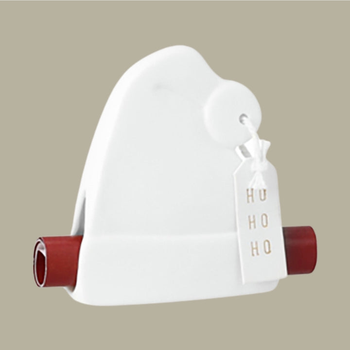 Diese schöne Mütze ist aus Porzellan, an ihr ist die weltweit verstandene Weihnachtsbotschaft "Ho Ho Ho" angebracht. Besonders wichtig für den Zweck des Geschenks ist aber die Aussparung für einen Geldschein, der zunächst mit einem Platzhalter aus farbigem Papier versehen ist.