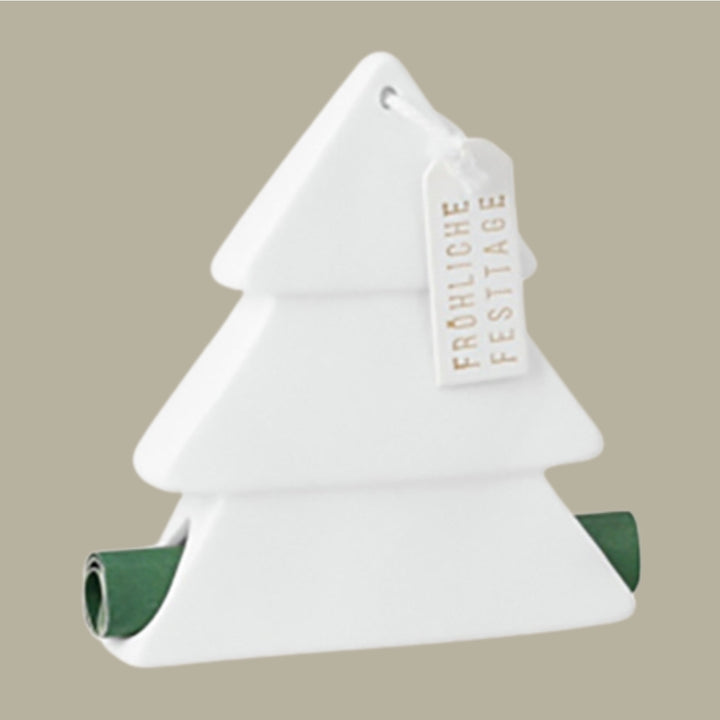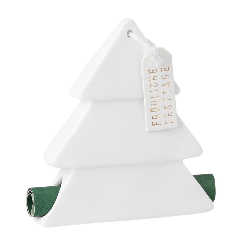 Diese schöne Tanne ist aus Porzellan, an ihr ist die Weihnachtsbotschaft "Fröhliche Weihnachten" angebracht. Besonders wichtig für den Zweck des Geschenks ist aber die Aussparung für einen Geldschein, der zunächst mit einem Platzhalter aus farbigem Papier versehen ist.