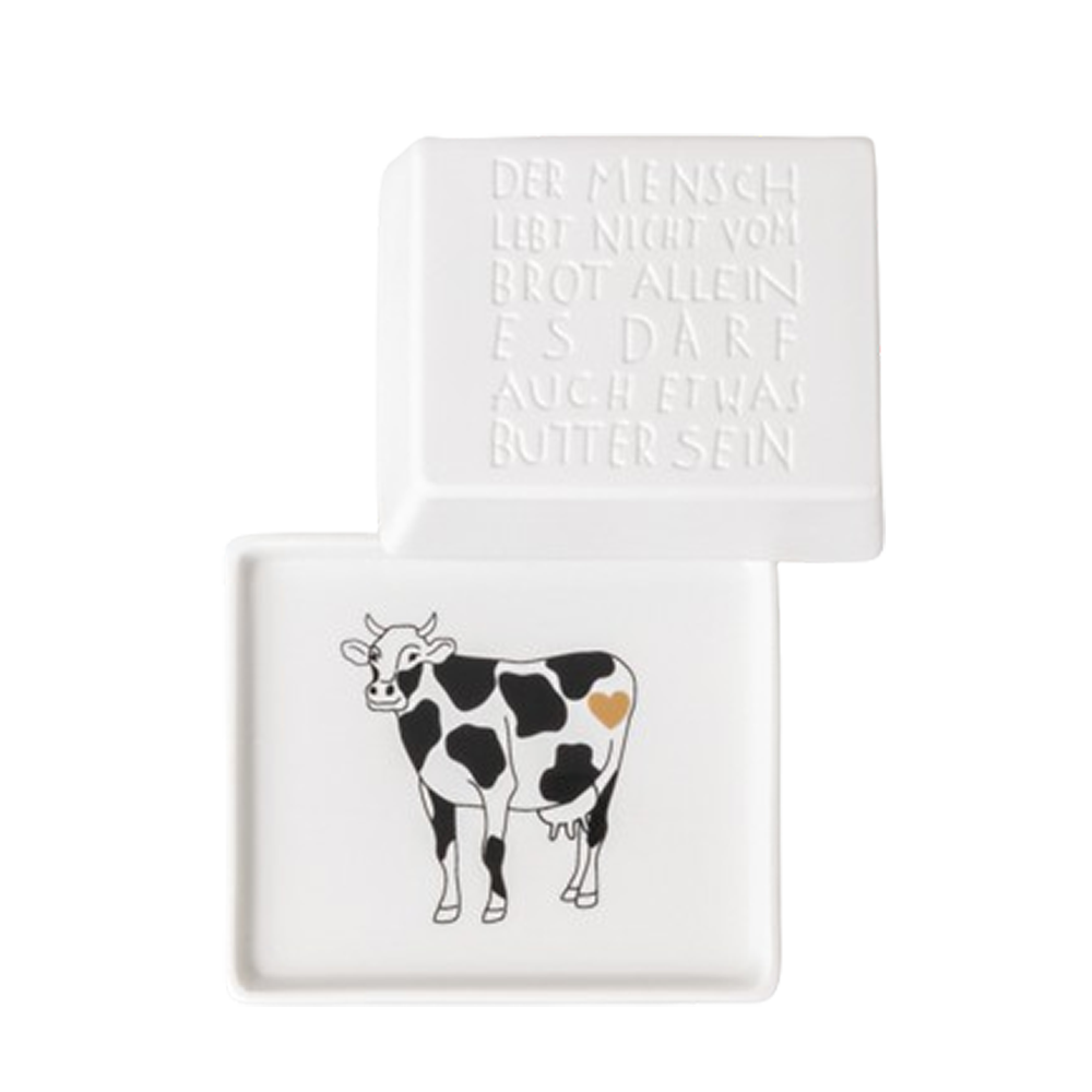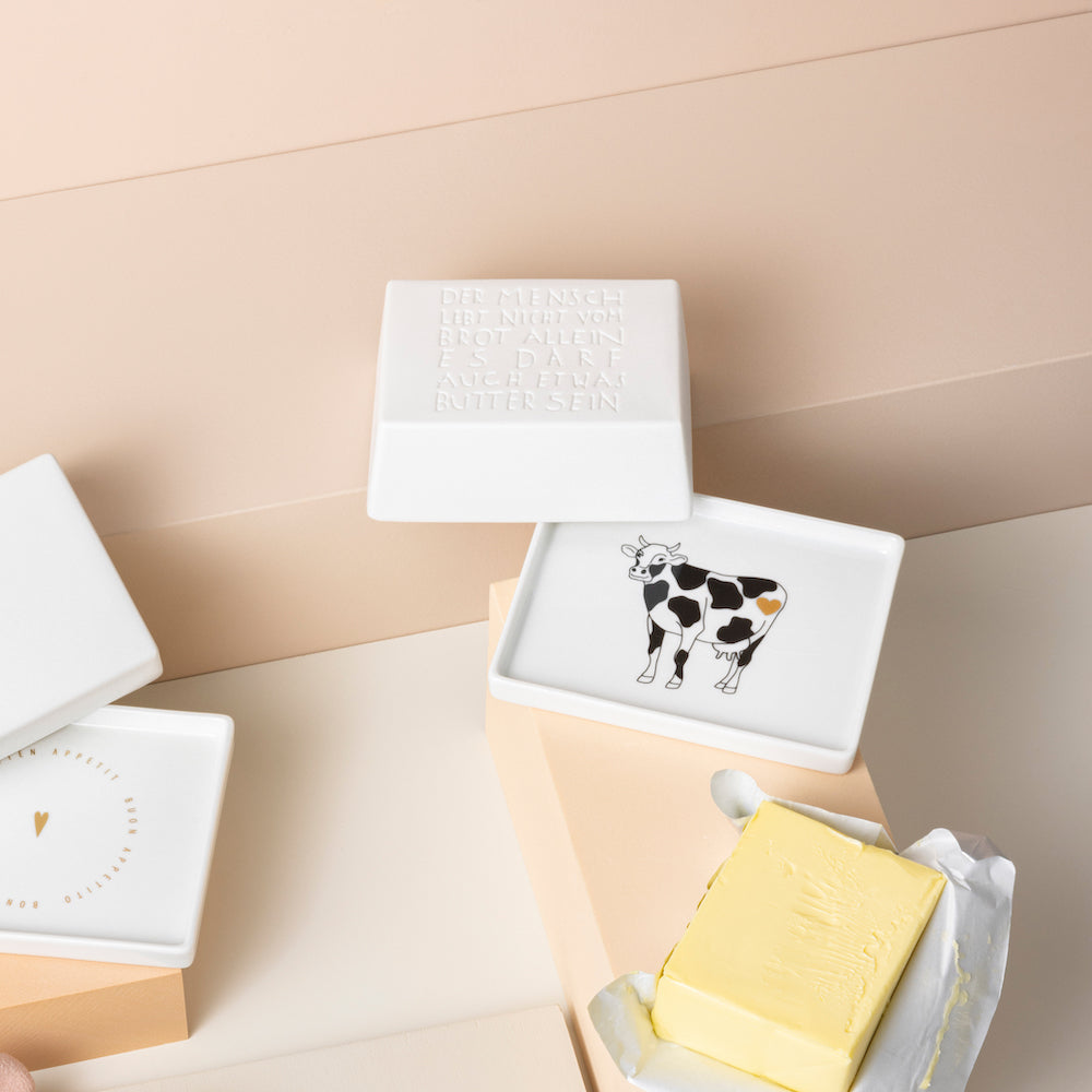 Die kleine Butterdose von Räder wird zum humorvollen Hingucker auf Deinem Tisch. Denn mit ihr heißt es – der Mensch lebt nicht vom Brot allein, es darf auch etwas Butter sein. Mit ihrer Größe von 11 x 5,4 x 9,5 passt ein normales Stück Butter perfekt in die Porzellan-Butterdose von Räder. Psst, wenn die Butter alle ist, kommt eine lächelnde Kuh zum Vorschein, bei deren Anblick uns ganz warm um‘s Herz wird.