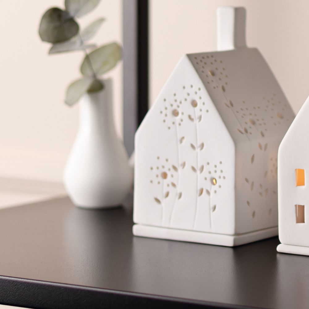 Das Lichthaus Blumenwiese von Räder ist aus unglasiertem Porzellan gefertigt. Es hat eine Größe von 7 x 13 x 7 cm und passt damit perfekt überall dort hin, wo Du es aufstellen möchtest. Damit Du das Kerzenlicht genießen kannst, kannst Du das Häuschen einfach hochheben und auf der Bodenplatte ein Teelicht platzieren. Ob das eine echte Kerze oder ein LED-Licht ist, kannst Du selbst entscheiden. Das Licht wird dann durch die vielen kleinen Blümchen leuchten, die in das Haus gefräst wurden. Dadurch entsteht ein wunderschönes Muster, dass Dein Zuhause noch gemütlicher macht.
