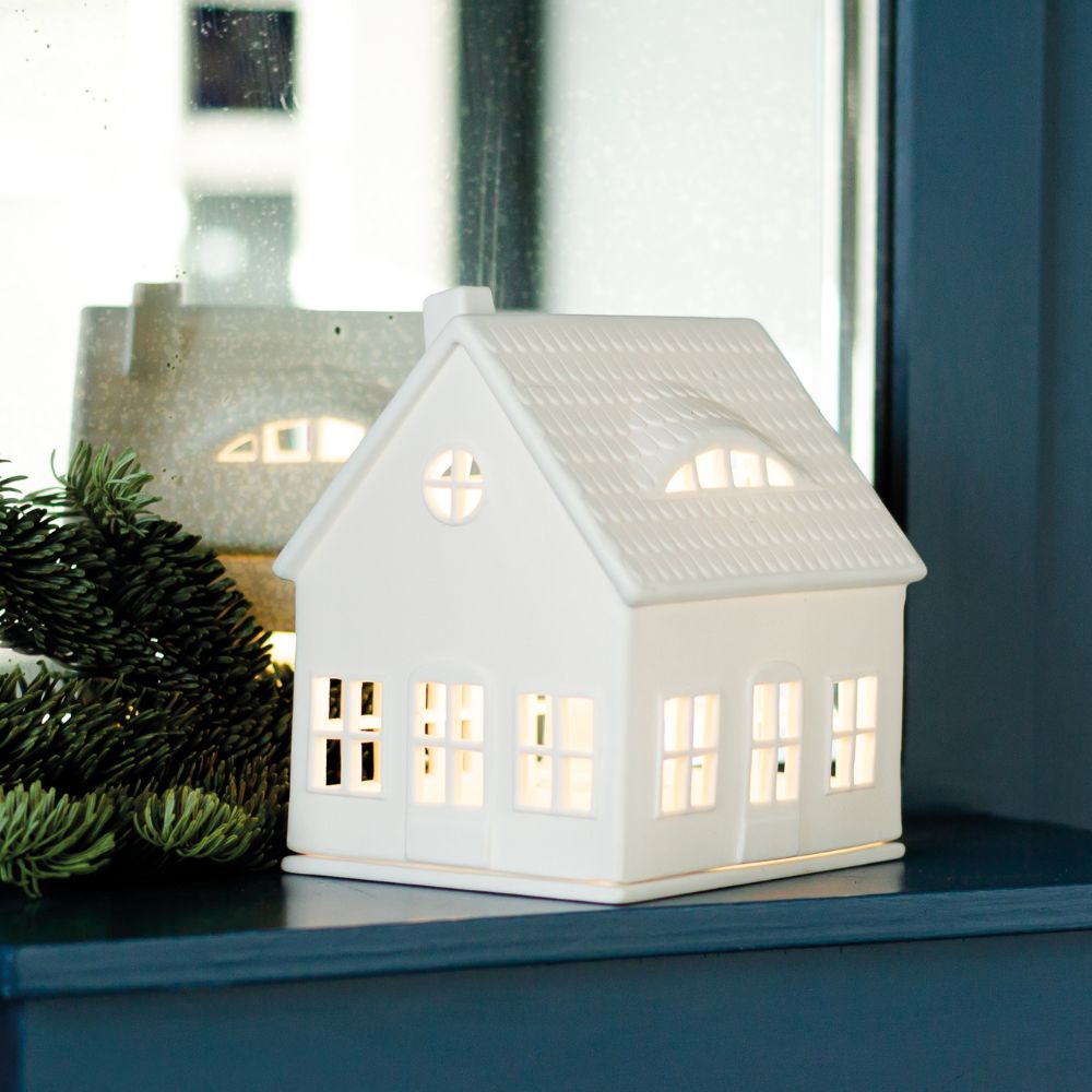 Mit diesem wunderschön gearbeiteten Lichthaus von Räder verzauberst Du Dein Zuhause in ein gemütliches Heim. Egal ob Sommer oder Winter - das weiße Gaubenhaus wird, bestückt mit einem Teelicht oder einer kleinen Lichterkette, stimmungsvoll erstrahlen. Das Lichthaus ist aus feinem Porzellan gefertigt und besitzt eine Bodenplatte, die als Kerzenteller dient. Kombiniere das Gaubenhaus mit weiteren Lichthäusern von Räder und erschaffe ein wundervolles Lichtermeer auf Deiner Fensterbank.