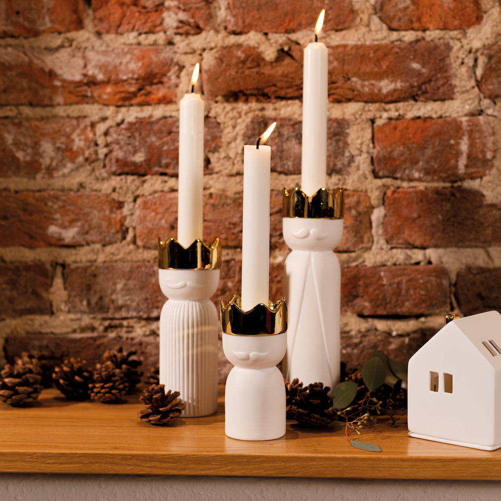 Caspar, Melchior und Balthasar kommen in diesem Jahr in Form der Räder Mini Königslichter im 3er-Set zu Dir nach Hause, um die frohe Botschaft zu verkünden. Die drei heiligen Könige aus dem Morgenland bestehen aus Porzellan und haben oben eine Aussparung für eine kleine Kerze, deren Licht auf so schöne und festliche Weise von den goldfarbenen Kronen widergespiegelt wird. Entdecke weitere Produkte von Räder für Dein Weihnachtsfest hier in unserem Shop.