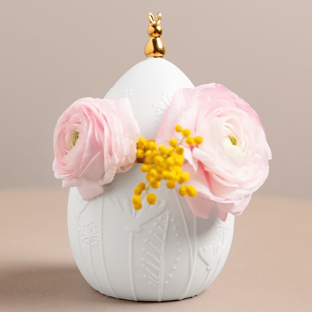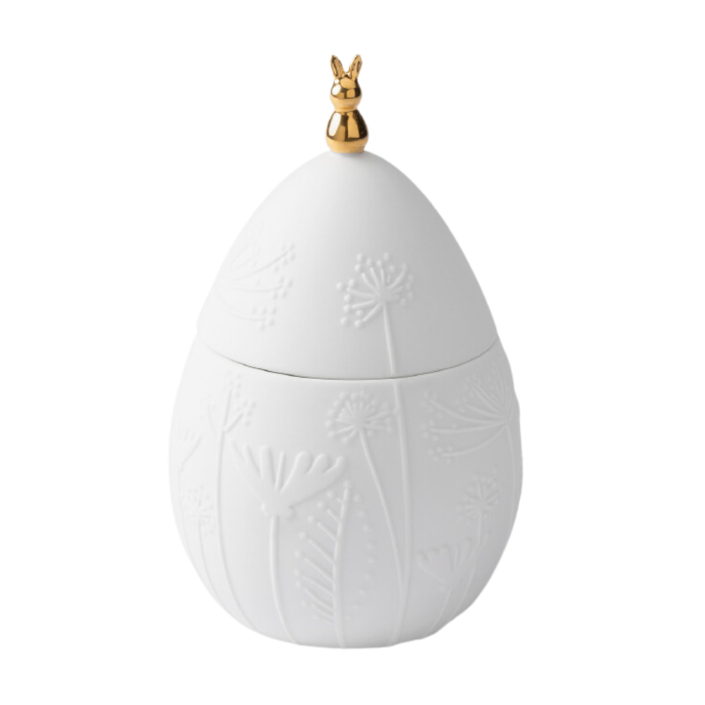 Auf der eiförmigen Aufbewahrungsdose von Räder thront stolz ein goldfarbenes Häschen, das zur Osterzeit gut über die Sachen in der Porzellandose wachen wird! Das florale Muster wird in der Frühlingszeit für einen tollen Hingucker auf dem Tisch, der Kommode oder dem Sideboard sorgen. Lasse Dich inspirieren und entdecke die schönen Osterprodukte von Räder hier in unserem Shop.
