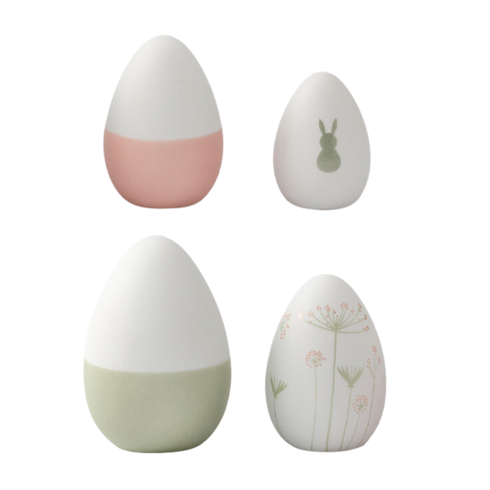 Egal ob auf dem Tisch, dem Sideboard oder der Fensterbank, das Ostereier 4er-Set von Räder sorgt mit seinen dezenten Farben Grün und Apricot für das richtige Maß an Frühlingsstimmung. Die dekorativen Eier bestehen aus Porzellan und haben einen Durchmesser von 3,5 bis 6 cm und eine Höhe von 5 bis 9 cm. Lasse Dich inspirieren und entdecke die schönen Osterprodukte von Räder hier in unserem Shop.
