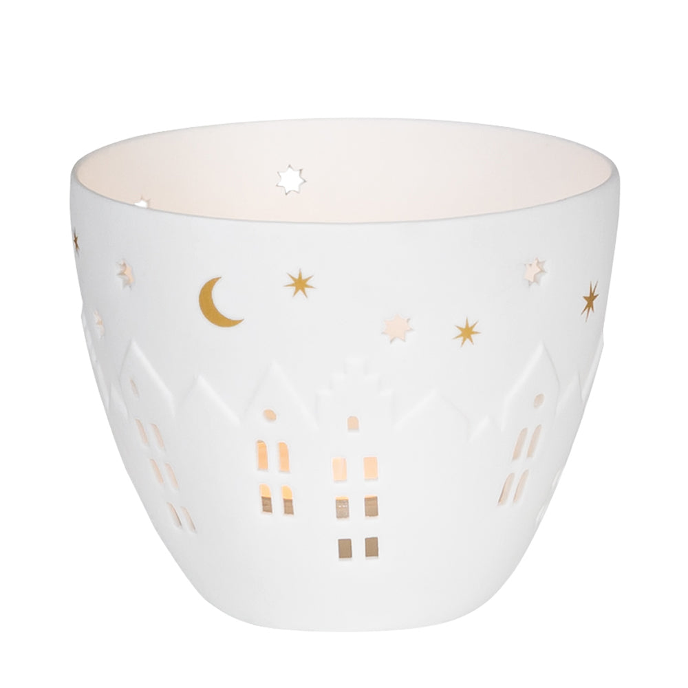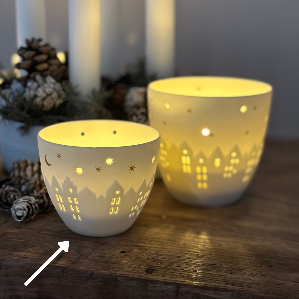 Das Räder Poesielicht Häuser in Mini bietet Dir einen traumhaft schönen Anblick, wenn Du ein Teelicht in die Mitte des Poesielichts stellst. Die Sonne versinkt langsam, die Sterne werden immer klarer und in den Fenstern der vielen Häuser beginnt ein Licht nach dem anderen zu leuchten. Das schöne Poesielicht in Mini von Räder ist 6,5 x 8 cm groß und besteht aus Porzellan.