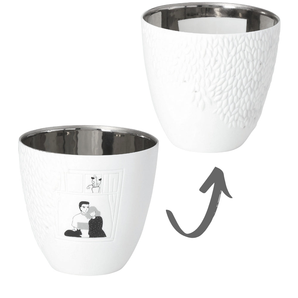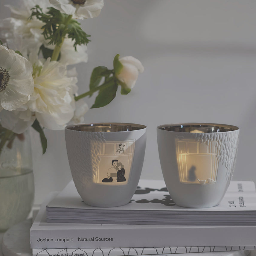 Das zarte Windlicht aus feinem Porzellan ist mit filigranen Blättern und einem Fenstermotiv verziert. Im Inneren findest Du eine silberfarbene Beschichtung, die beim Kerzenschein zum Leben erwacht. Sobald Du ein Teelicht hineinstellst, entsteht ein warmes, sanftes Lichtspiel. Es macht Freude, immer wieder hinzusehen.