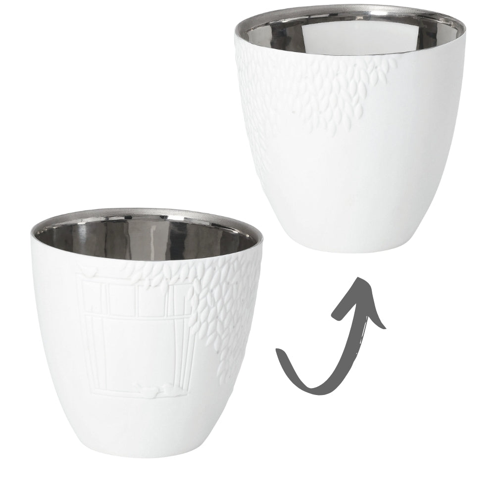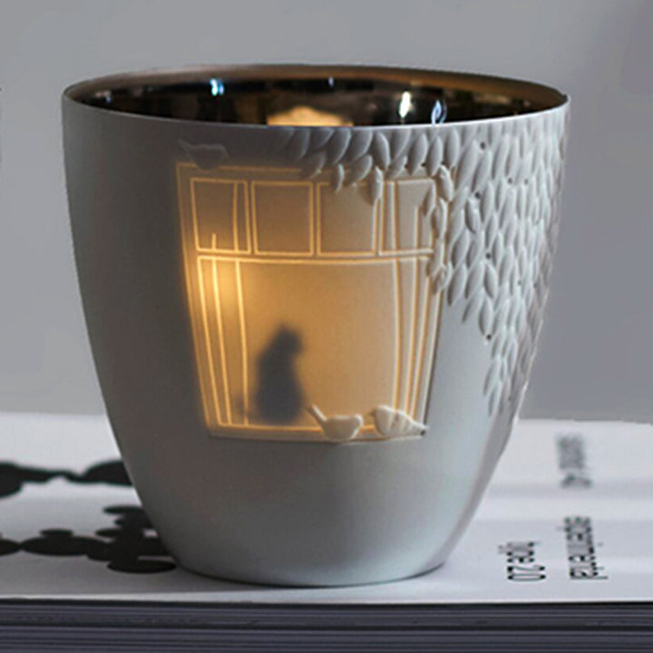 Das zarte Windlicht aus feinem, weißen Porzellan ist mit filigranen Blättern und einem Fenstermotiv verziert. Im Inneren findest Du eine silberfarbene Beschichtung, die beim Kerzenschein zum Leben erwacht. Sobald Du ein Teelicht hineinstellst, entsteht ein warmes, sanftes Lichtspiel. Es macht Freude, immer wieder hinzusehen.