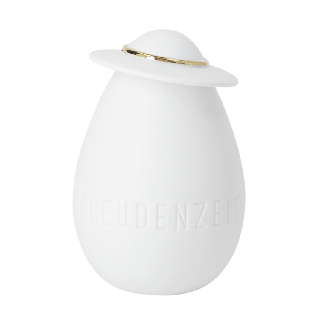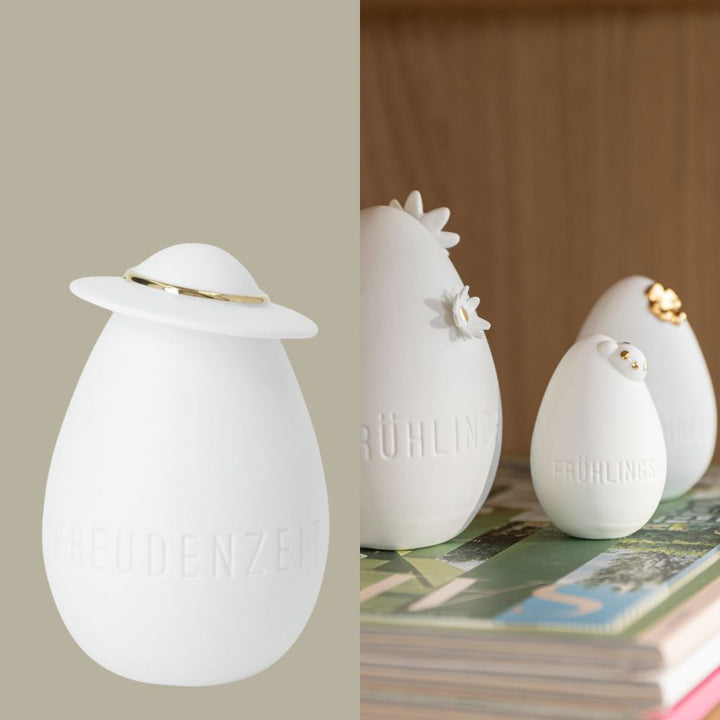 Frühlingszeit ist Freudenzeit – und genau das strahlt dieses liebevoll gestaltete Dekostück aus. Das 11,5 cm hohe Ei wird von einem breiten Hut gekrönt, der mit einem goldfarbenen Band verziert ist und dem Design eine elegante, zugleich humorvolle Note verleiht. Das schlichte Weiß des hochwertigen Porzellans bildet dabei einen schönen Kontrast zu den goldfarbenen Akzenten und lässt das Ei besonders edel wirken.